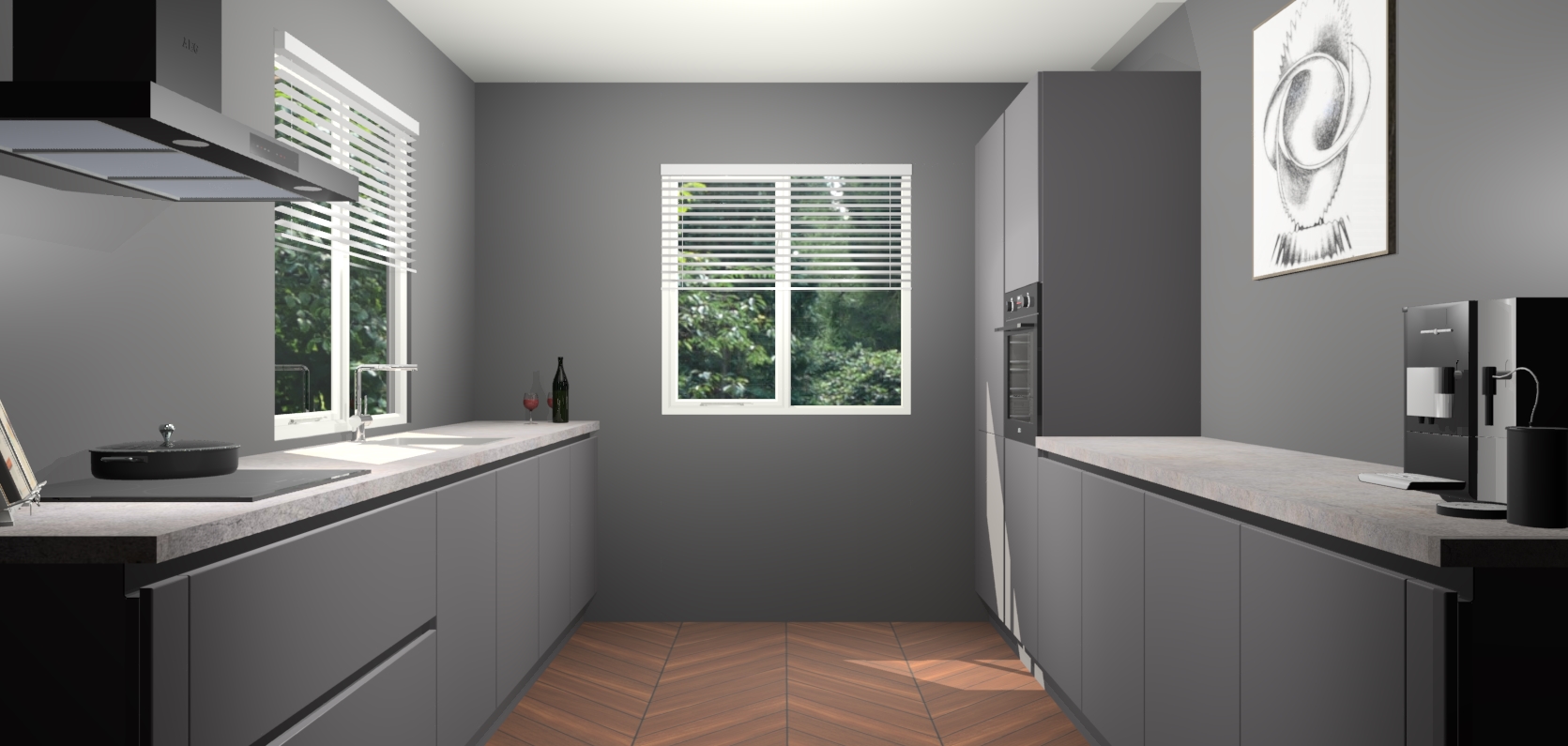 Welkom bij de Onyxgrijze greeploze keuken Lusaka. Deze prachtige keuken zal de komende jaren het middelpunt van de belangstelling in uw huis zijn. Uitgerust met vijf inbouwapparaten komt u nooit kookgereedschap tekort. Bovendien geeft de warme houtlook elke ruimte een uitnodigende en tijdloze uitstraling.