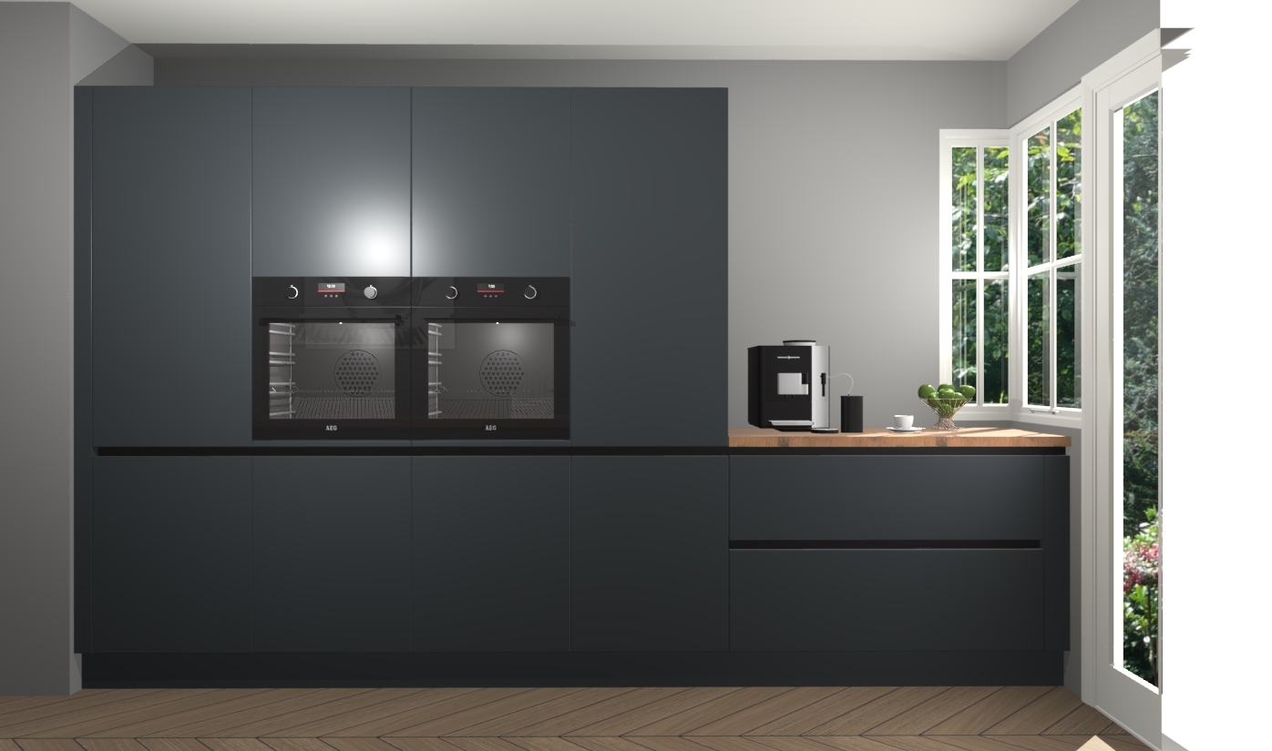 Een stijlvolle en praktische keuken als deze mag gezien worden. Dankzij de prachtige onyxgrijze matte afwerking wordt de keuken gemakkelijk het middelpunt van uw huis - hij ziet er geweldig uit onder allerlei lichtomstandigheden, van dag tot nacht!