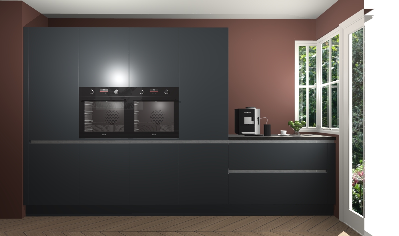 Een stijlvolle en praktische keuken als deze mag gezien worden. Dankzij de prachtige onyxgrijze matte afwerking wordt de keuken gemakkelijk het middelpunt van uw huis - hij ziet er geweldig uit onder allerlei lichtomstandigheden, van dag tot nacht!