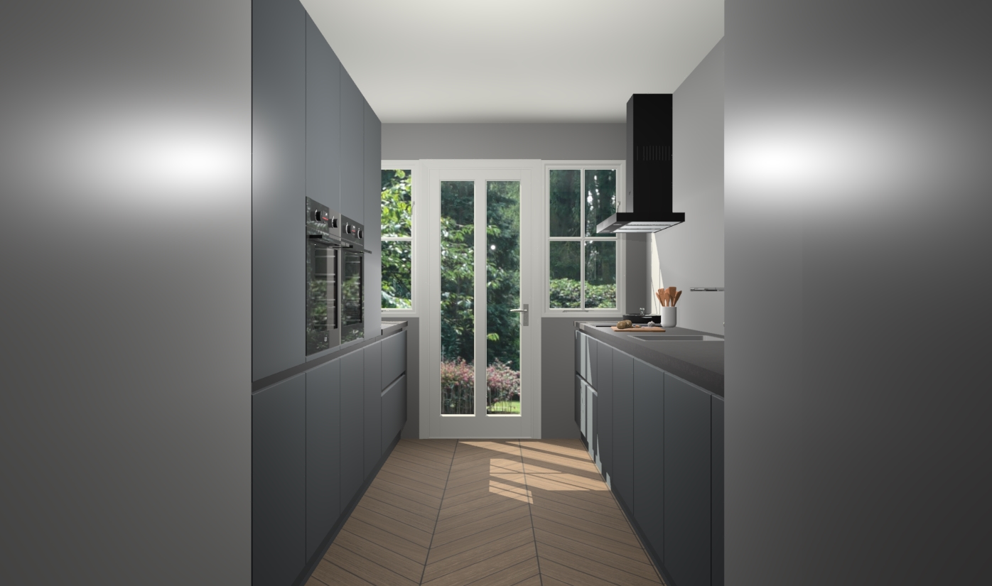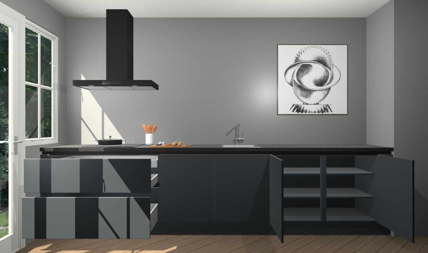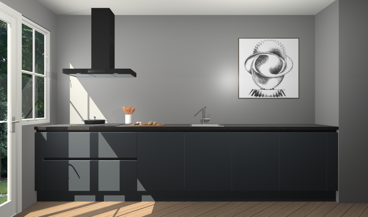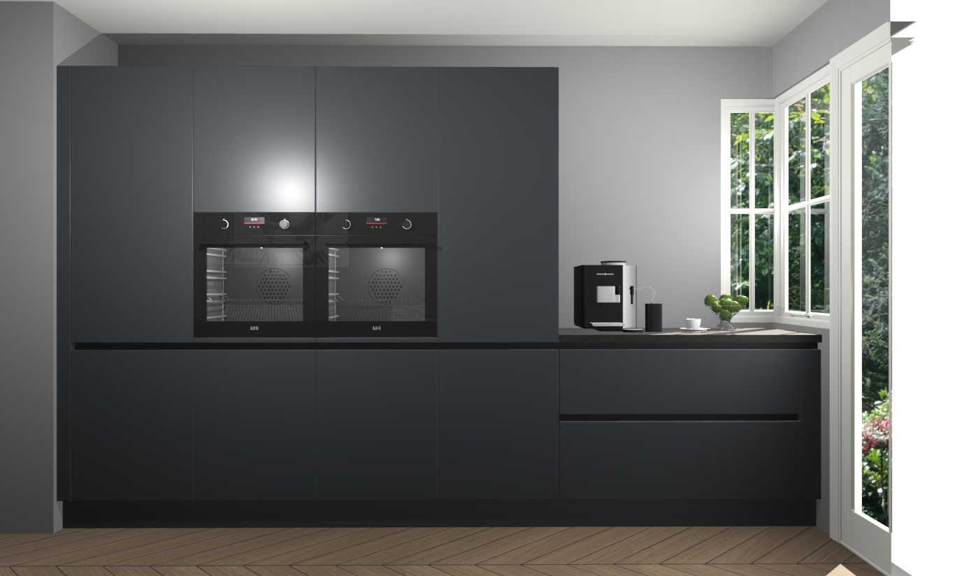 Een stijlvolle en praktische keuken als deze mag gezien worden. Dankzij de prachtige onyxgrijze matte afwerking wordt de keuken gemakkelijk het middelpunt van uw huis - hij ziet er geweldig uit onder allerlei lichtomstandigheden, van dag tot nacht!