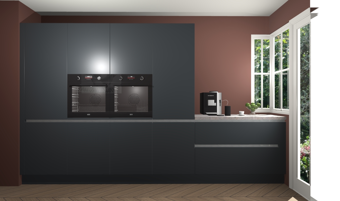 Een stijlvolle en praktische keuken als deze mag gezien worden. Dankzij de prachtige onyxgrijze matte afwerking wordt de keuken gemakkelijk het middelpunt van uw huis - hij ziet er geweldig uit onder allerlei lichtomstandigheden, van dag tot nacht!