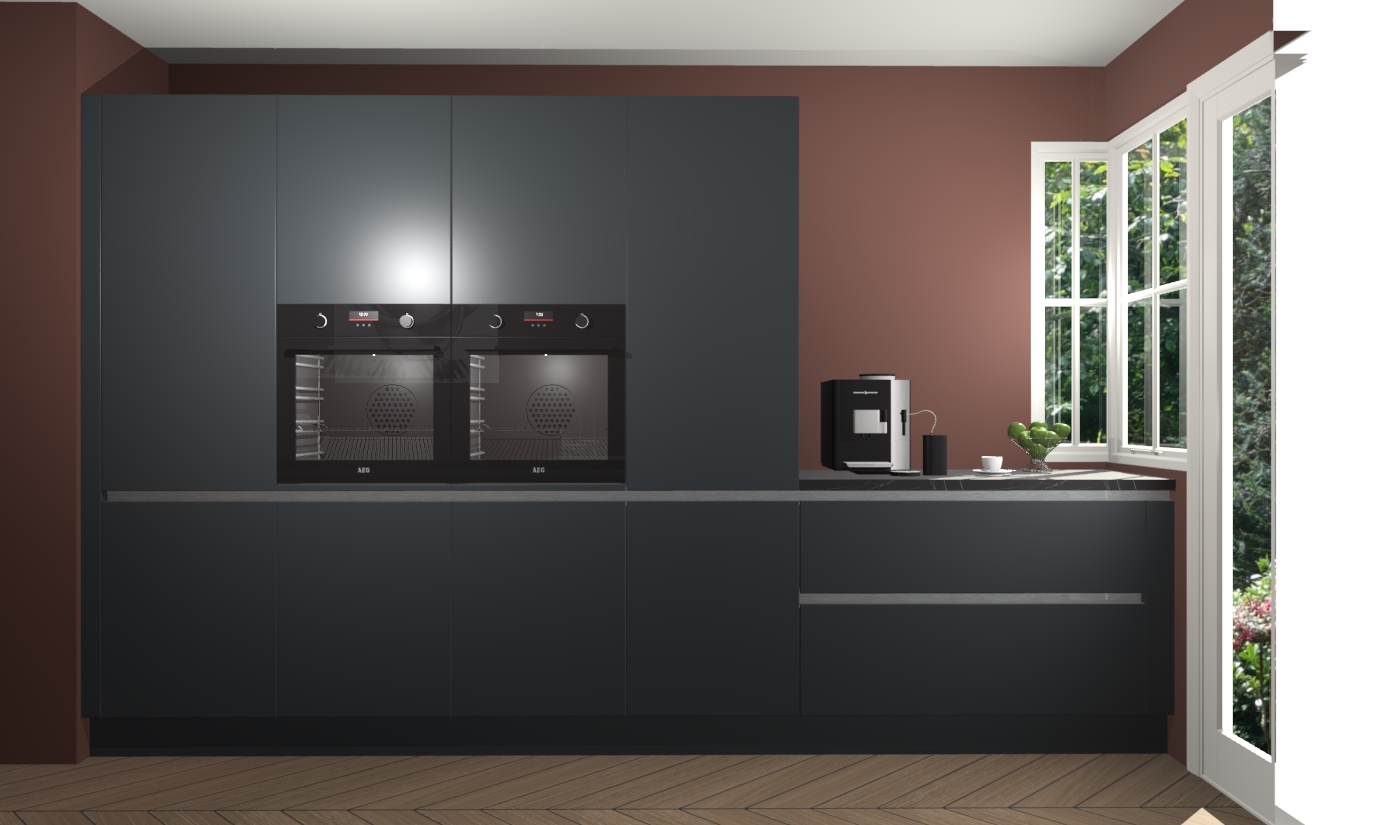 Een stijlvolle en praktische keuken als deze mag gezien worden. Dankzij de prachtige onyxgrijze matte afwerking wordt de keuken gemakkelijk het middelpunt van uw huis - hij ziet er geweldig uit onder allerlei lichtomstandigheden, van dag tot nacht!
