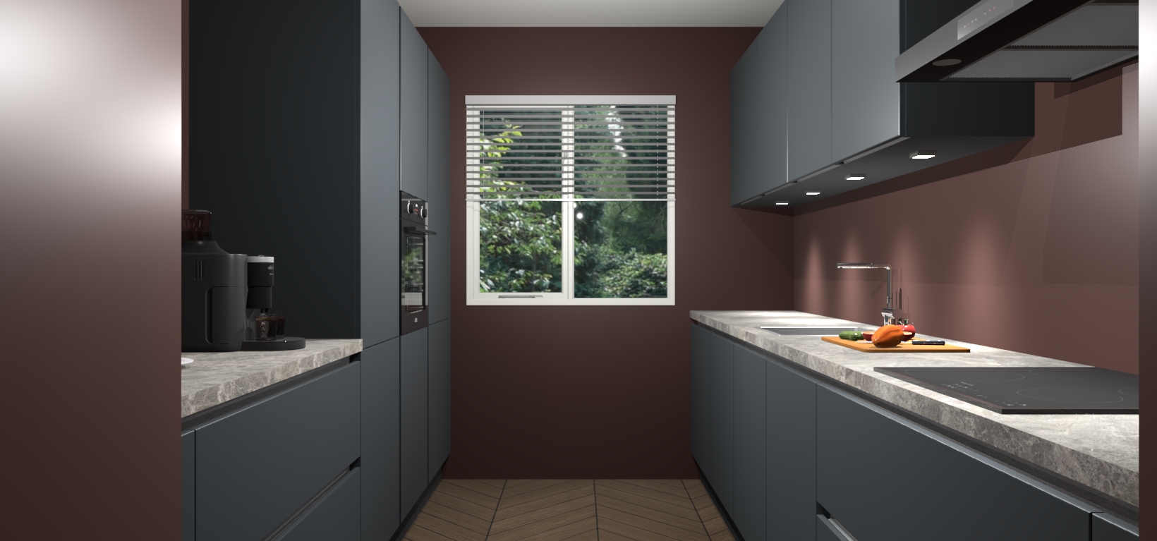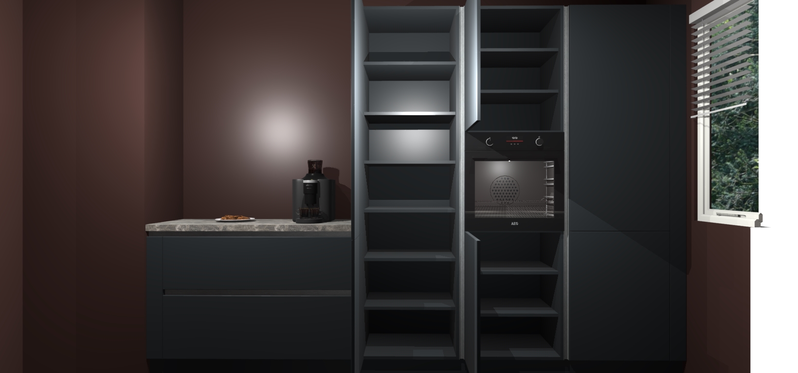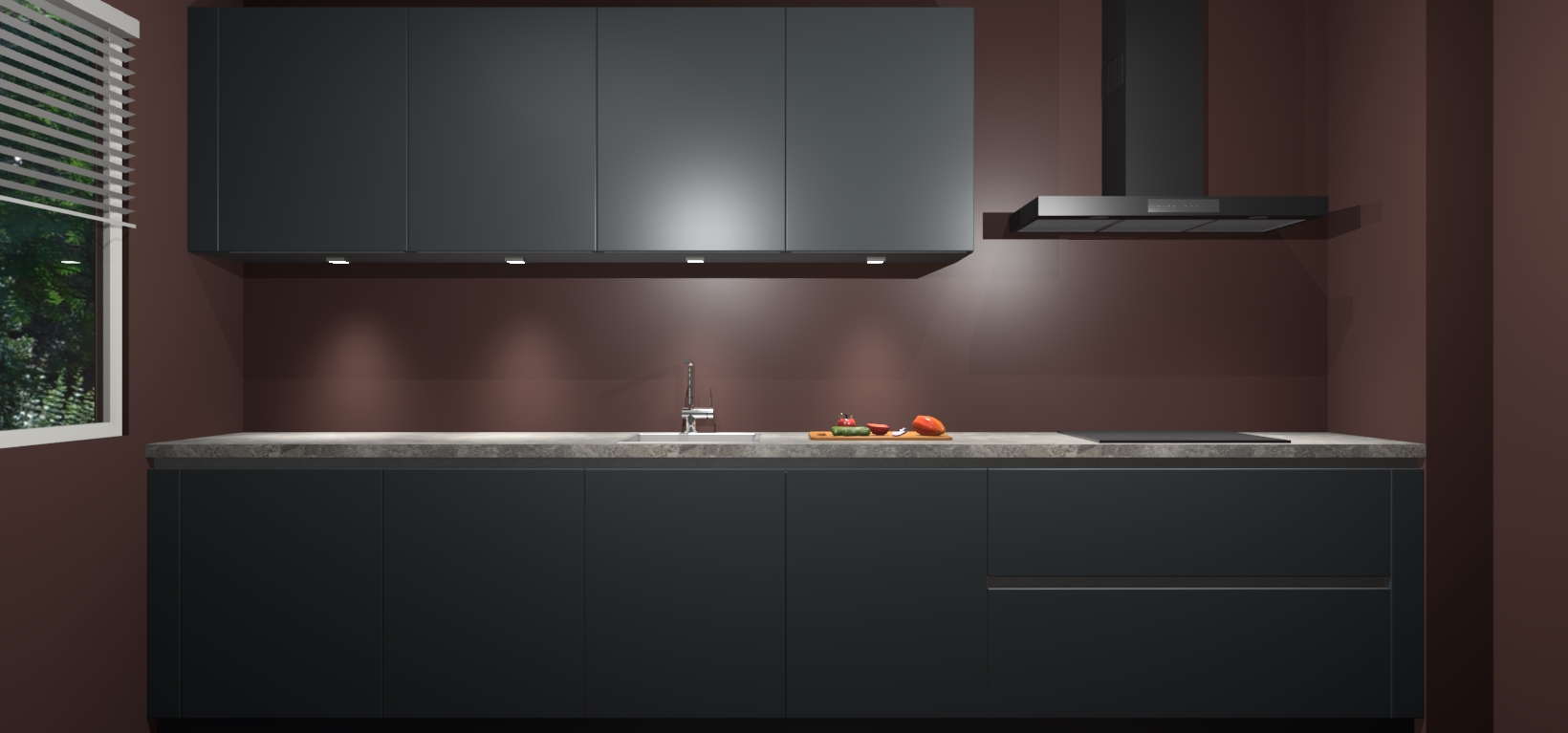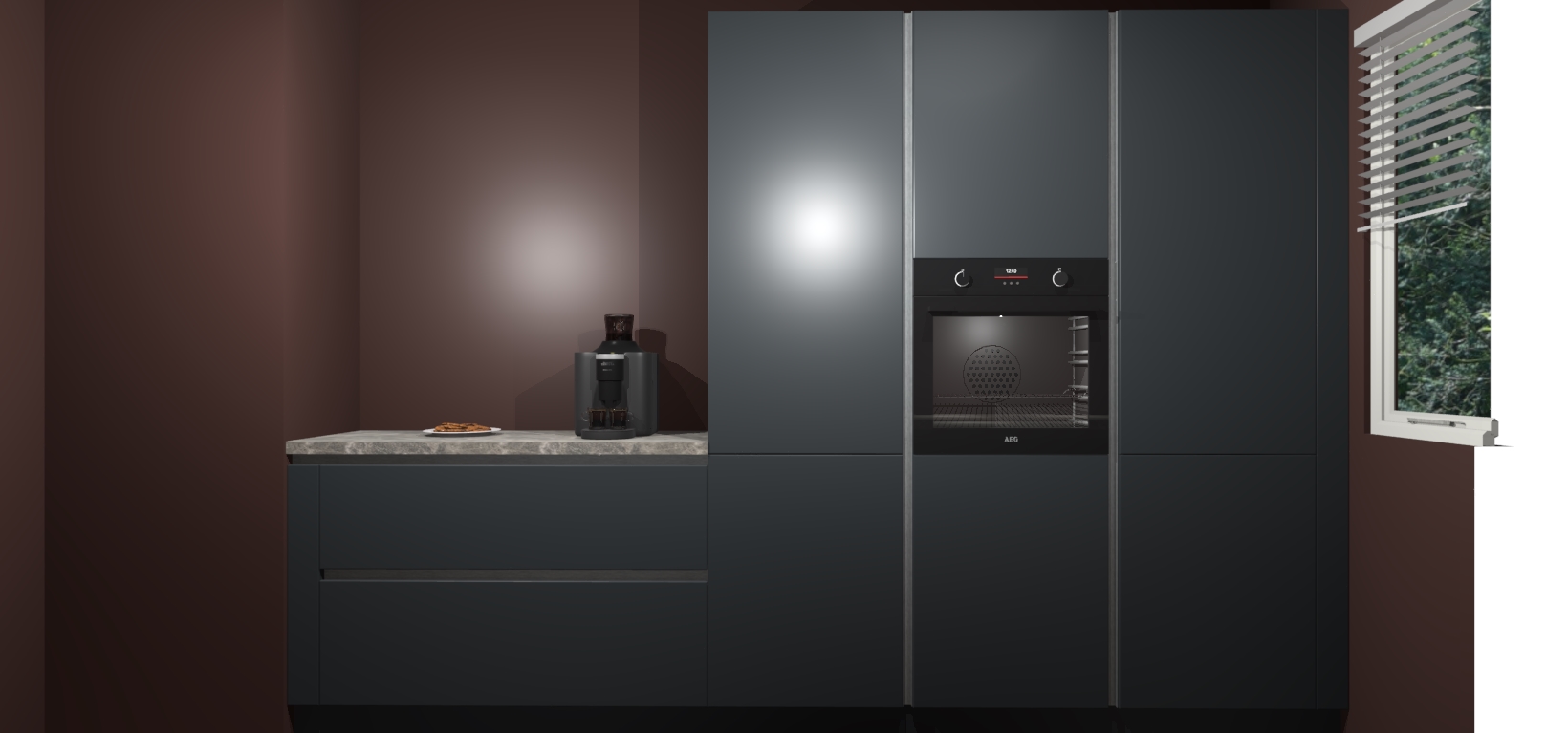 Een stijlvolle en praktische keuken als deze mag gezien worden. Dankzij de prachtige Onyxgrijze matte afwerking wordt de keuken gemakkelijk het middelpunt van uw huis - hij ziet er geweldig uit onder allerlei lichtomstandigheden, van dag tot nacht!