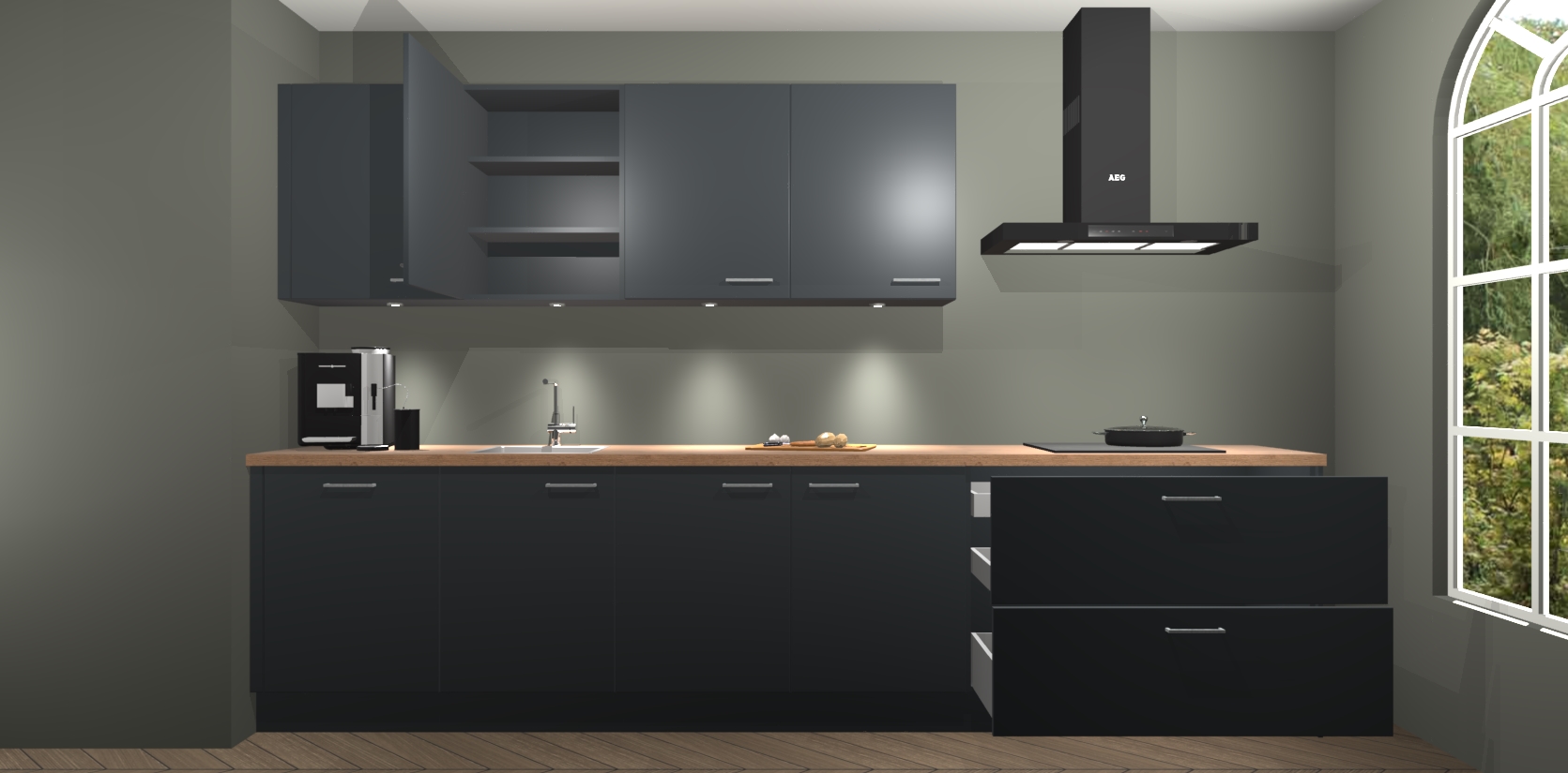 De softclose deuren openen en sluiten is ook heel eenvoudig - geniet van een moeiteloze keukenervaring, zelfs als er kinderen rondlopen. Voor extra gemak bij het plaatsen van uw bestelling bieden we ook een upgrade naar een kookplaat met geïntegreerde afzuiging.