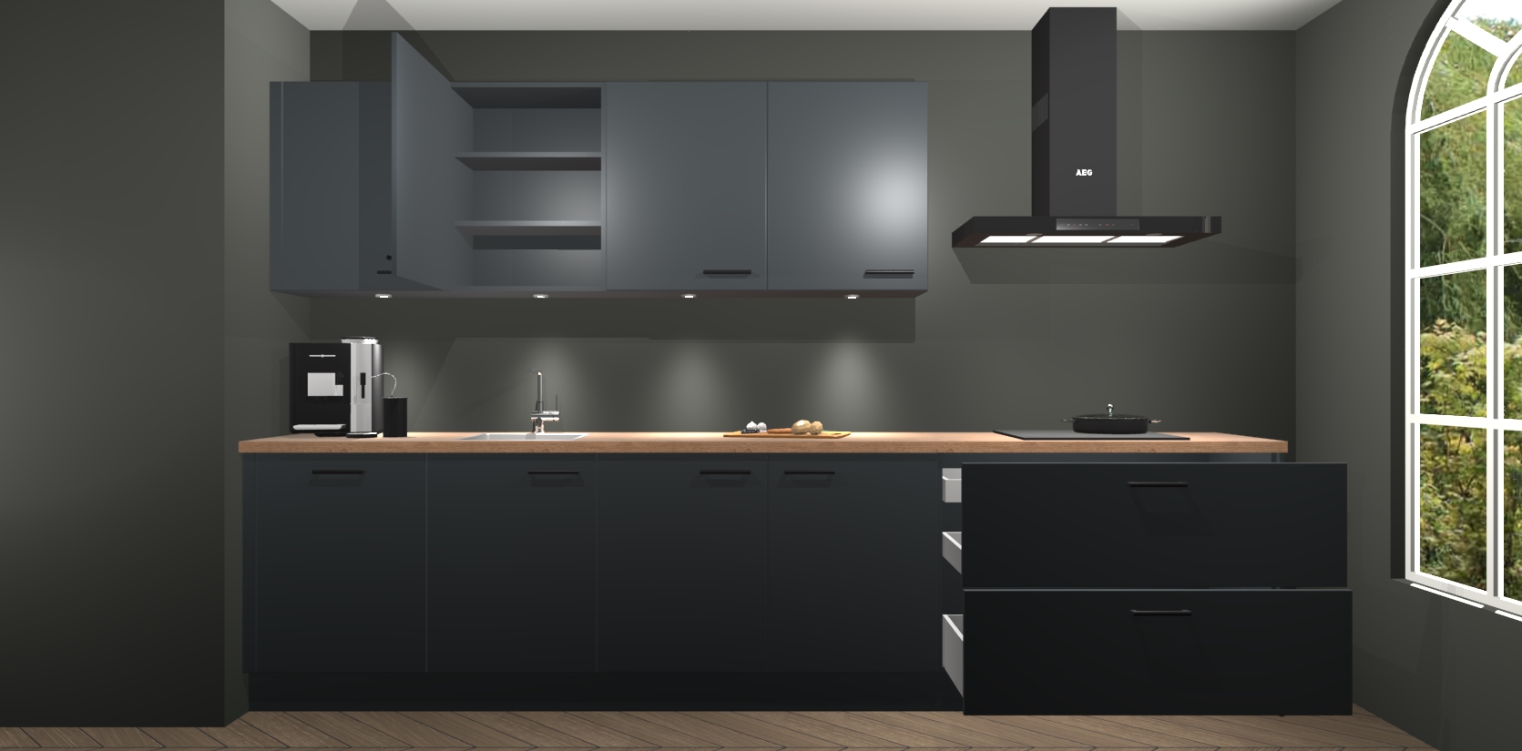 De softclose deuren openen en sluiten is ook heel eenvoudig - geniet van een moeiteloze keukenervaring, zelfs als er kinderen rondlopen. Voor extra gemak bij het plaatsen van uw bestelling bieden we ook een upgrade naar een kookplaat met geïntegreerde afzuiging.
