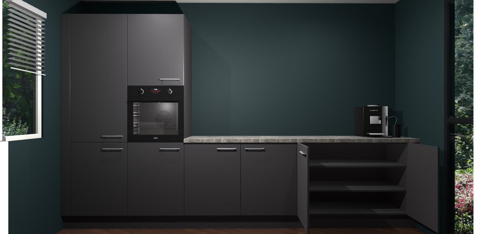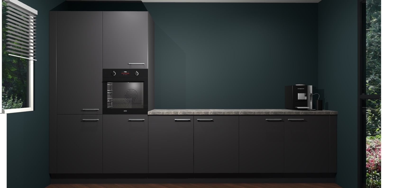 Welkom bij de Onyxgrijze keuken Lusaka. Deze prachtige keuken zal de komende jaren het middelpunt van de belangstelling in uw huis zijn. Uitgerust met vijf inbouwapparaten komt u nooit kookgereedschap tekort. Bovendien geeft de warme houtlook elke ruimte een uitnodigende en tijdloze uitstraling.