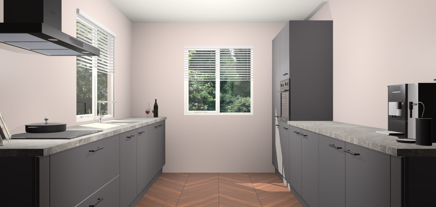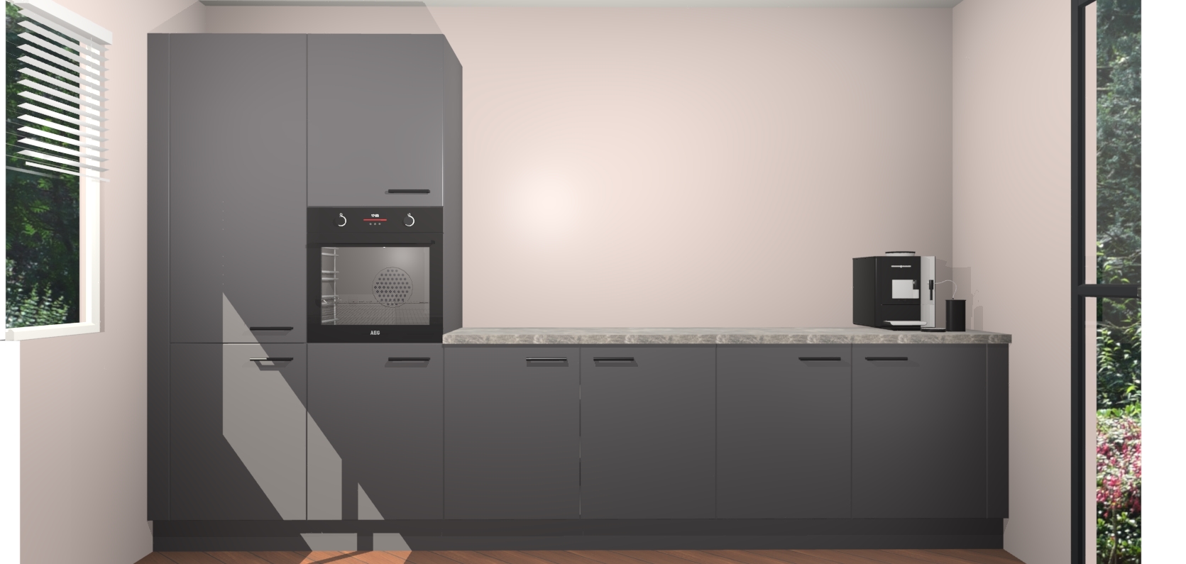 Welkom bij de Onyxgrijze keuken Lusaka. Deze prachtige keuken zal de komende jaren het middelpunt van de belangstelling in uw huis zijn. Uitgerust met vijf inbouwapparaten komt u nooit kookgereedschap tekort. Bovendien geeft de warme houtlook elke ruimte een uitnodigende en tijdloze uitstraling.