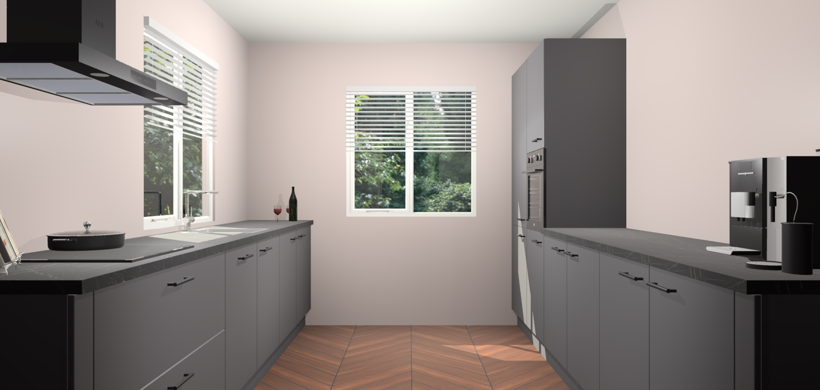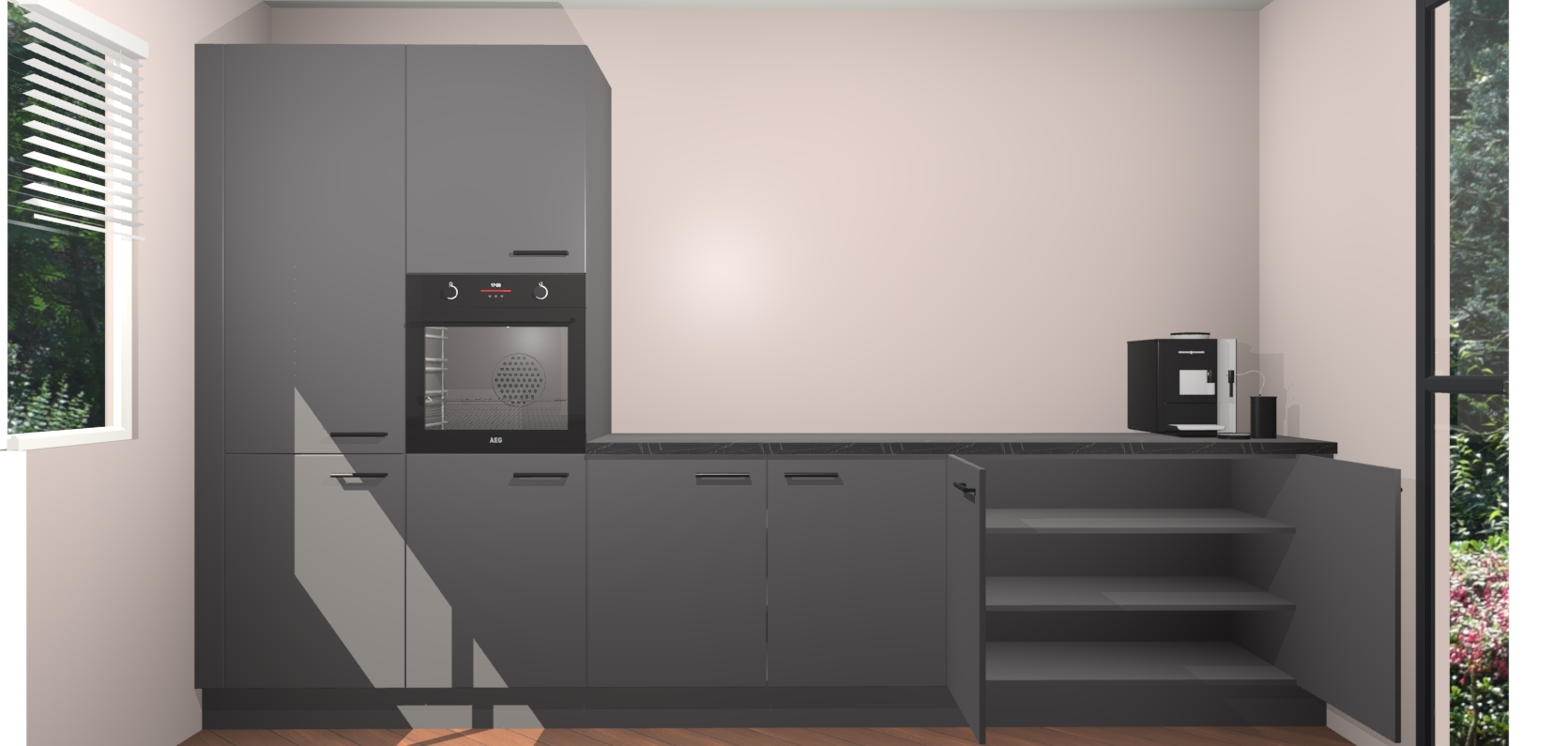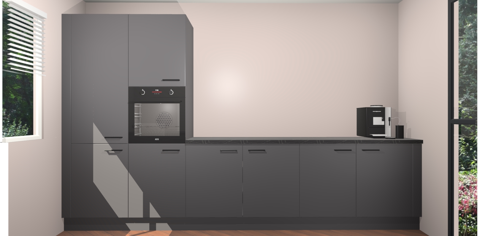 Welkom bij de Onyxgrijze keuken Lusaka. Deze prachtige keuken zal de komende jaren het middelpunt van de belangstelling in uw huis zijn. Uitgerust met vijf inbouwapparaten komt u nooit kookgereedschap tekort. Bovendien geeft de warme houtlook elke ruimte een uitnodigende en tijdloze uitstraling.