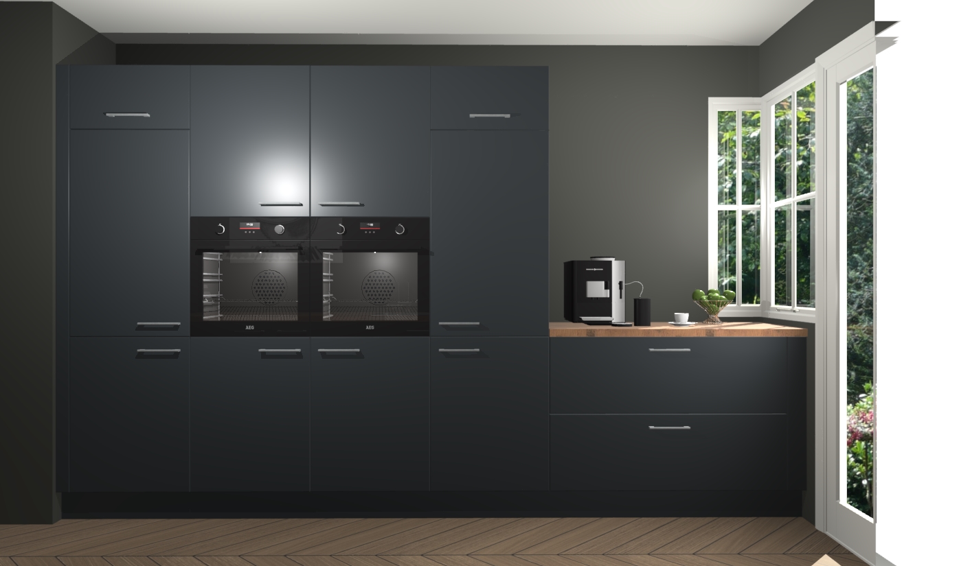 Een stijlvolle en praktische keuken als deze mag gezien worden. Dankzij de prachtige onyxgrijze matte afwerking wordt de keuken gemakkelijk het middelpunt van uw huis - hij ziet er geweldig uit onder allerlei lichtomstandigheden, van dag tot nacht!