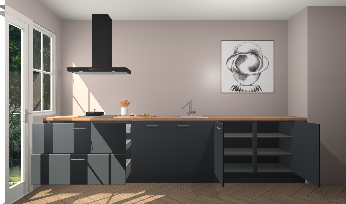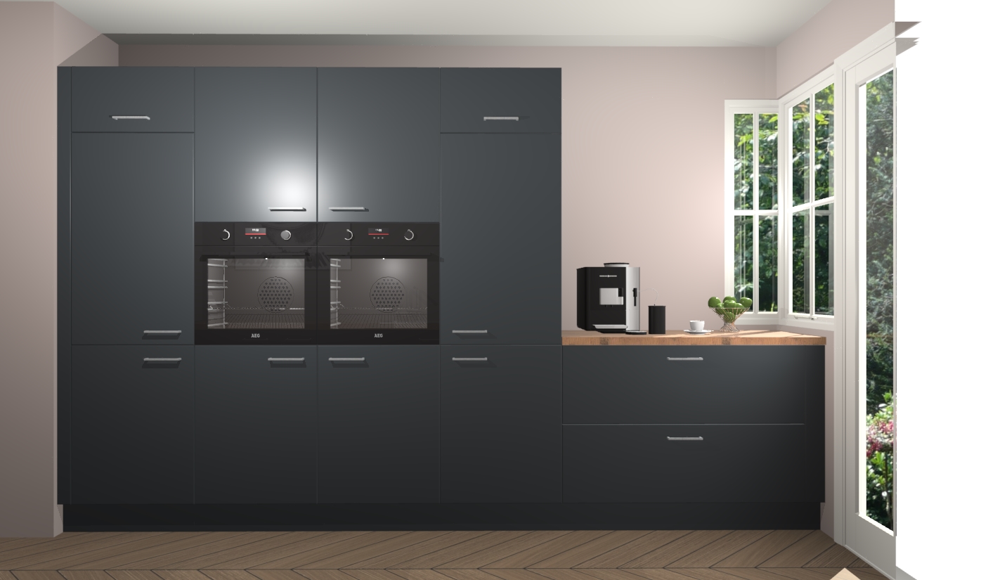 Een stijlvolle en praktische keuken als deze mag gezien worden. Dankzij de prachtige onyxgrijze matte afwerking wordt de keuken gemakkelijk het middelpunt van uw huis - hij ziet er geweldig uit onder allerlei lichtomstandigheden, van dag tot nacht!