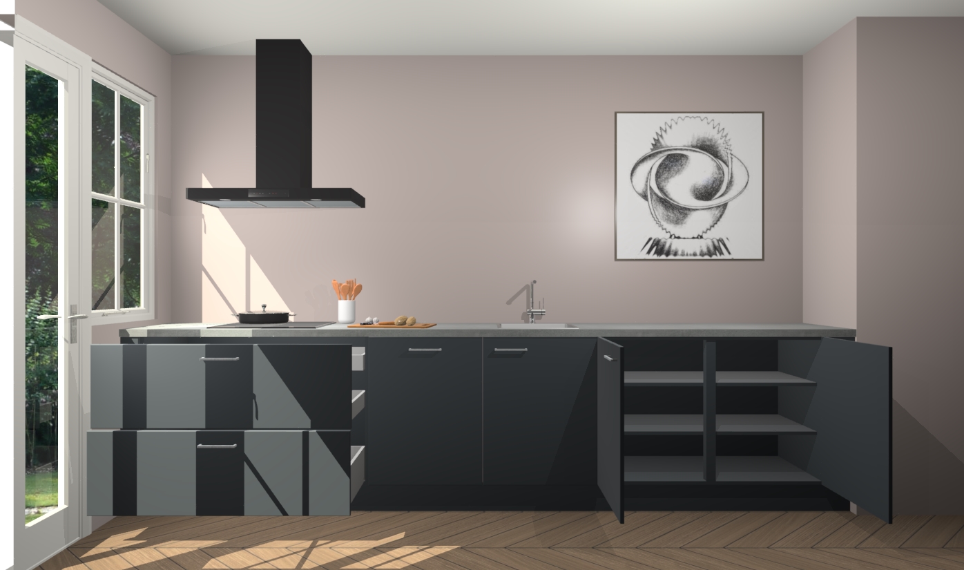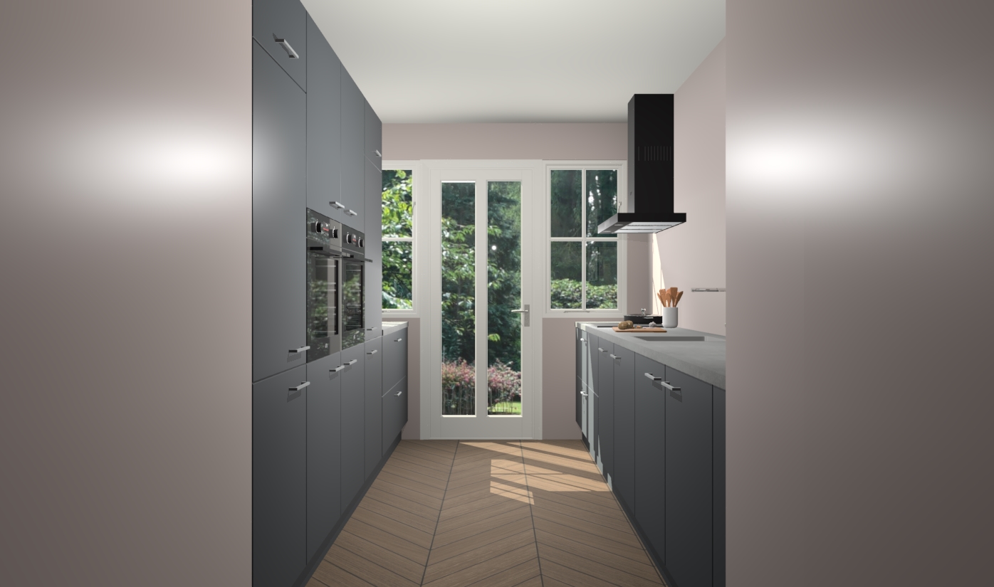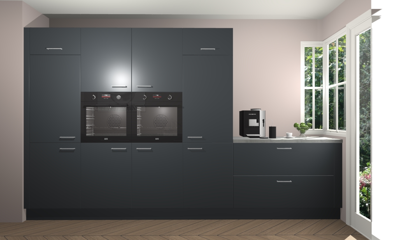 Een stijlvolle en praktische keuken als deze mag gezien worden. Dankzij de prachtige onyxgrijze matte afwerking wordt de keuken gemakkelijk het middelpunt van uw huis - hij ziet er geweldig uit onder allerlei lichtomstandigheden, van dag tot nacht!