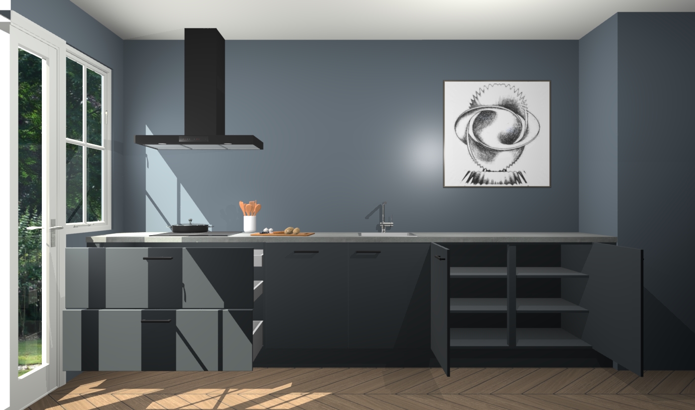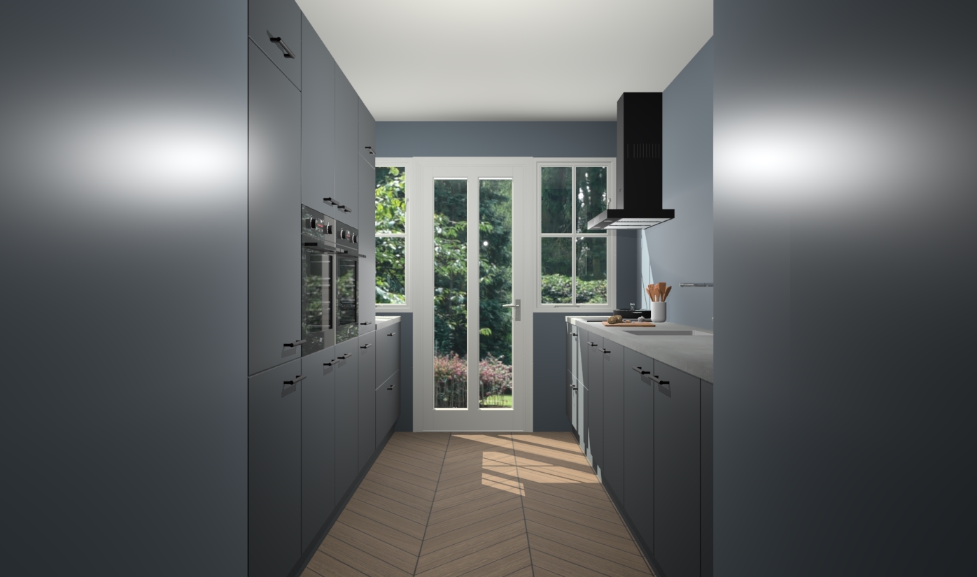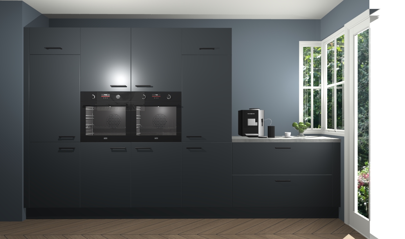 Een stijlvolle en praktische keuken als deze mag gezien worden. Dankzij de prachtige onyxgrijze matte afwerking wordt de keuken gemakkelijk het middelpunt van uw huis - hij ziet er geweldig uit onder allerlei lichtomstandigheden, van dag tot nacht!