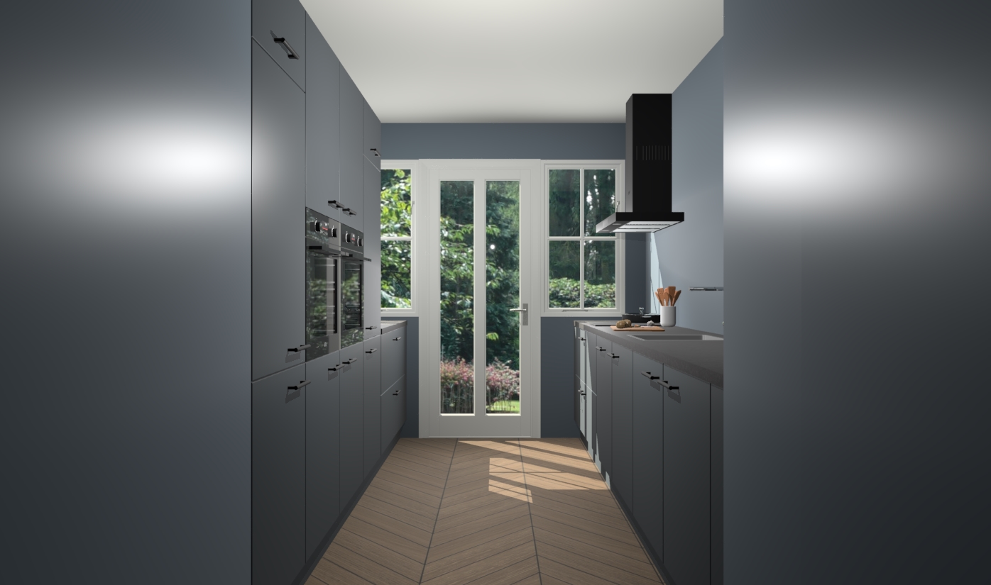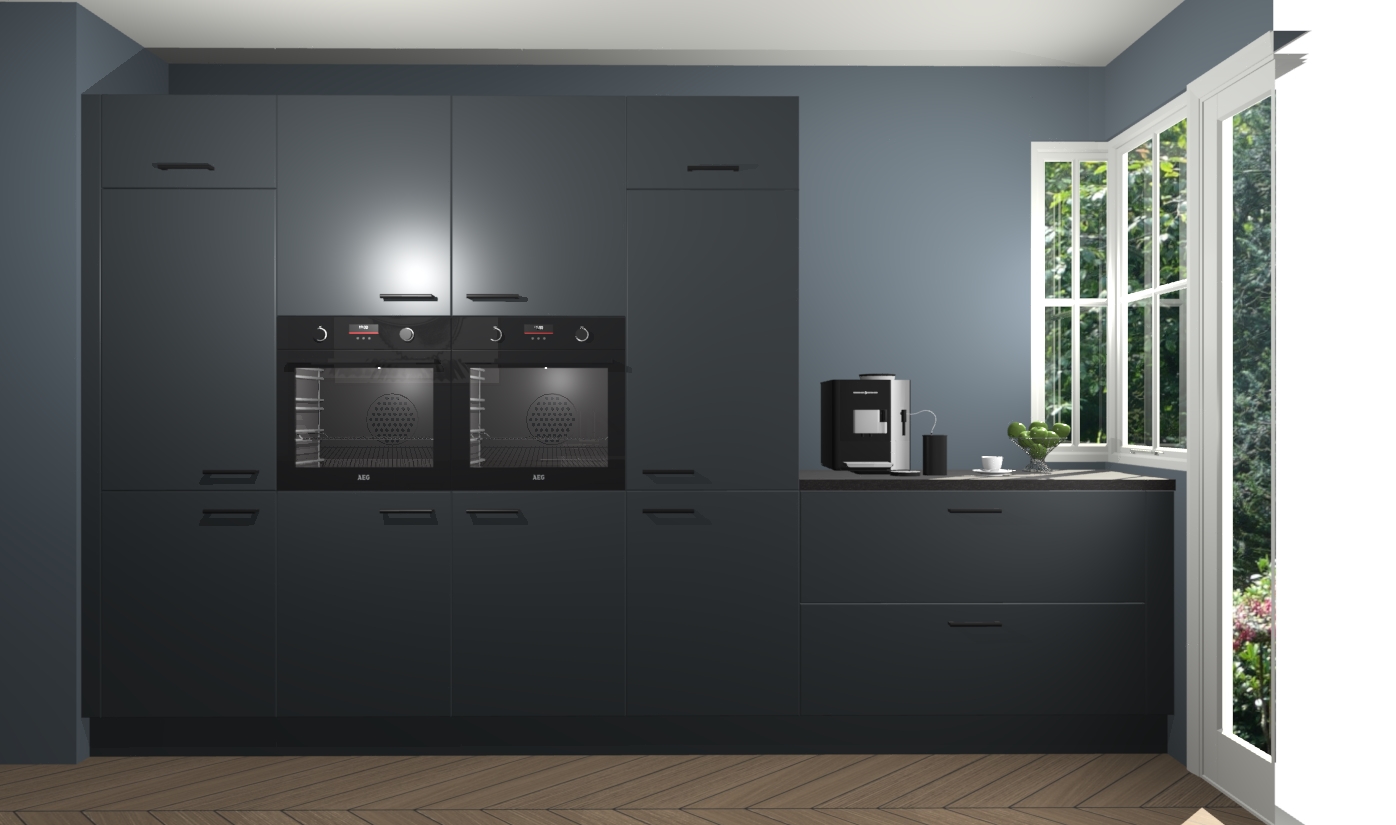 Een stijlvolle en praktische keuken als deze mag gezien worden. Dankzij de prachtige onyxgrijze matte afwerking wordt de keuken gemakkelijk het middelpunt van uw huis - hij ziet er geweldig uit onder allerlei lichtomstandigheden, van dag tot nacht!
