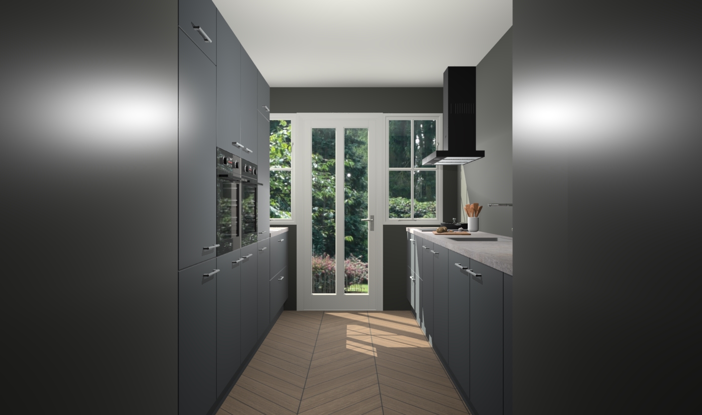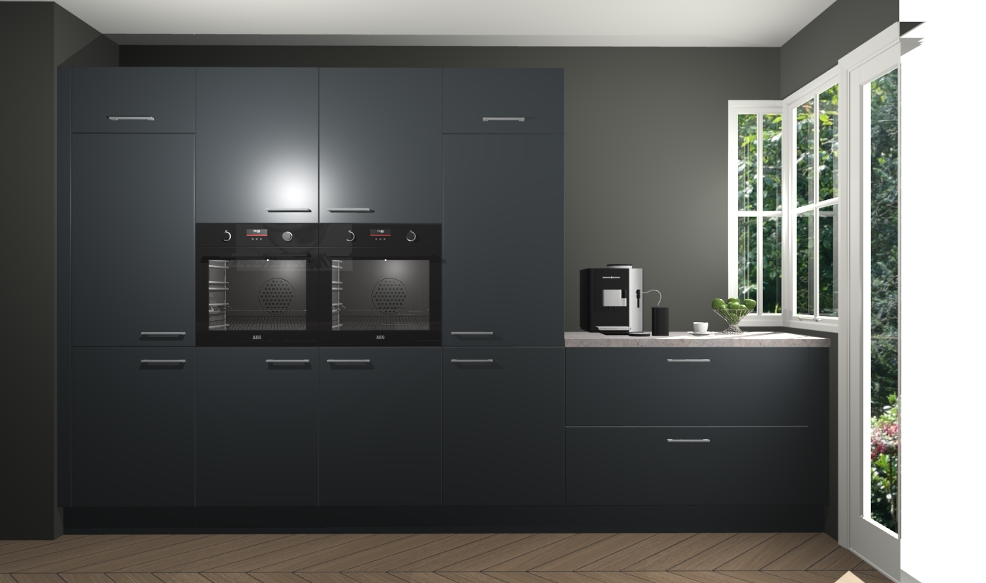 Een stijlvolle en praktische keuken als deze mag gezien worden. Dankzij de prachtige onyxgrijze matte afwerking wordt de keuken gemakkelijk het middelpunt van uw huis - hij ziet er geweldig uit onder allerlei lichtomstandigheden, van dag tot nacht!