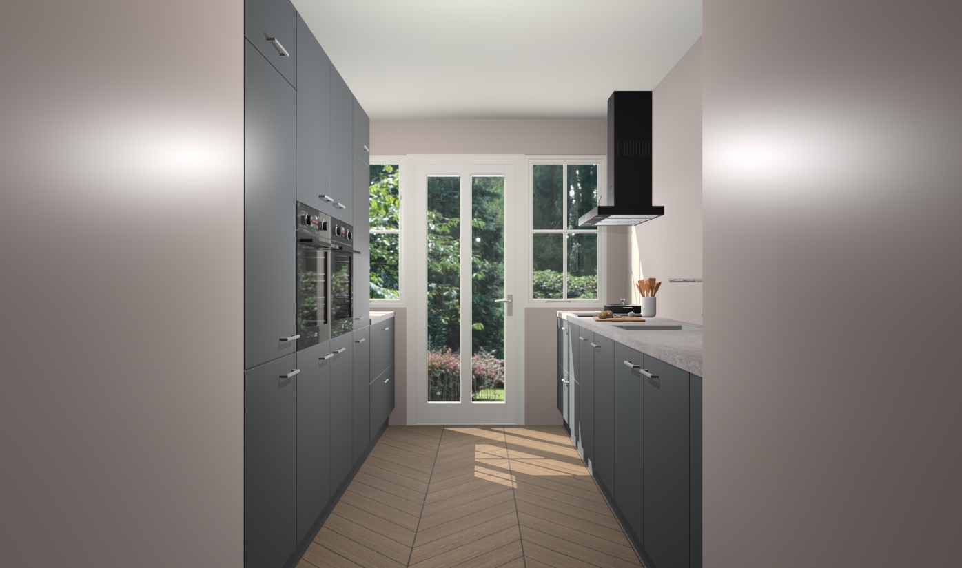 Een stijlvolle en praktische keuken als deze mag gezien worden. Dankzij de prachtige onyxgrijze matte afwerking wordt de keuken gemakkelijk het middelpunt van uw huis - hij ziet er geweldig uit onder allerlei lichtomstandigheden, van dag tot nacht!
