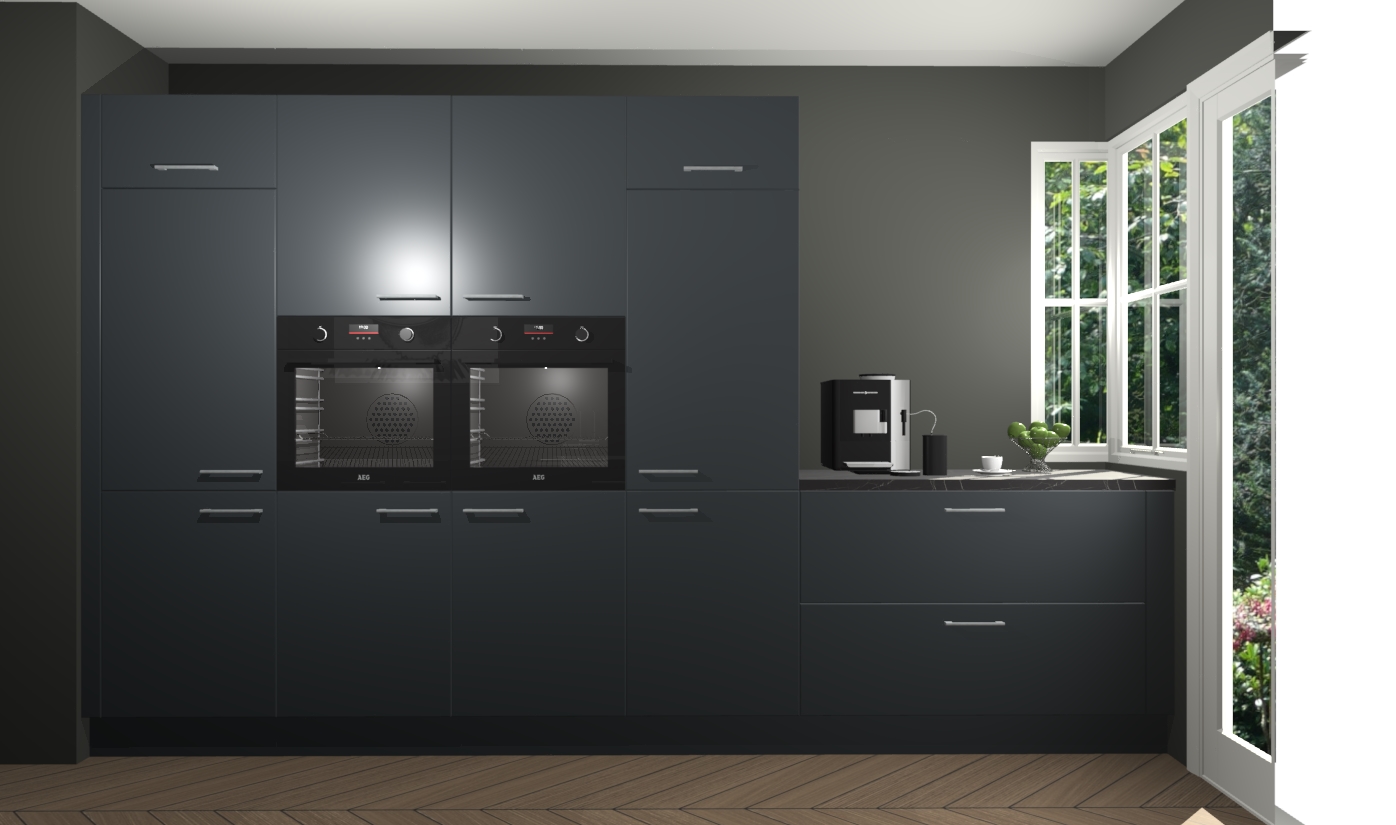Een stijlvolle en praktische keuken als deze mag gezien worden. Dankzij de prachtige onyxgrijze matte afwerking wordt de keuken gemakkelijk het middelpunt van uw huis - hij ziet er geweldig uit onder allerlei lichtomstandigheden, van dag tot nacht!