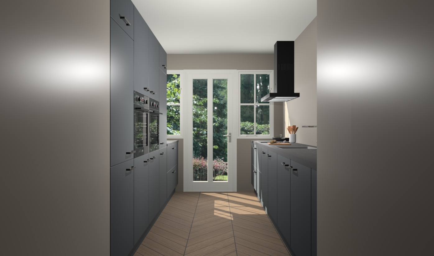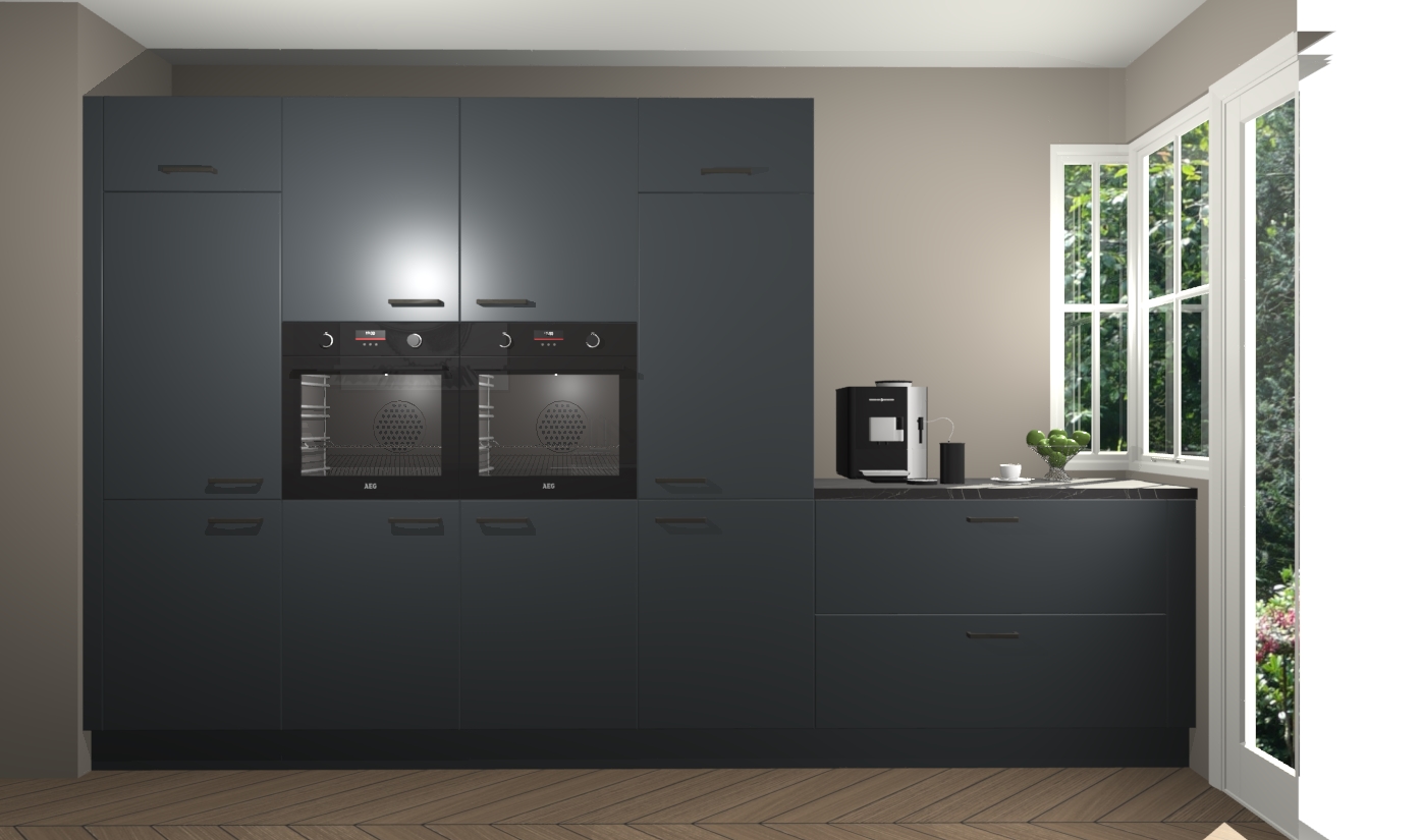 Een stijlvolle en praktische keuken als deze mag gezien worden. Dankzij de prachtige onyxgrijze matte afwerking wordt de keuken gemakkelijk het middelpunt van uw huis - hij ziet er geweldig uit onder allerlei lichtomstandigheden, van dag tot nacht!