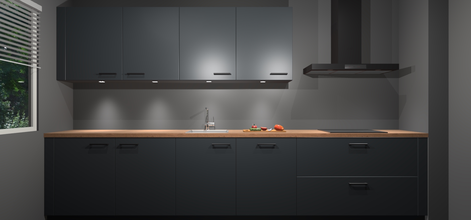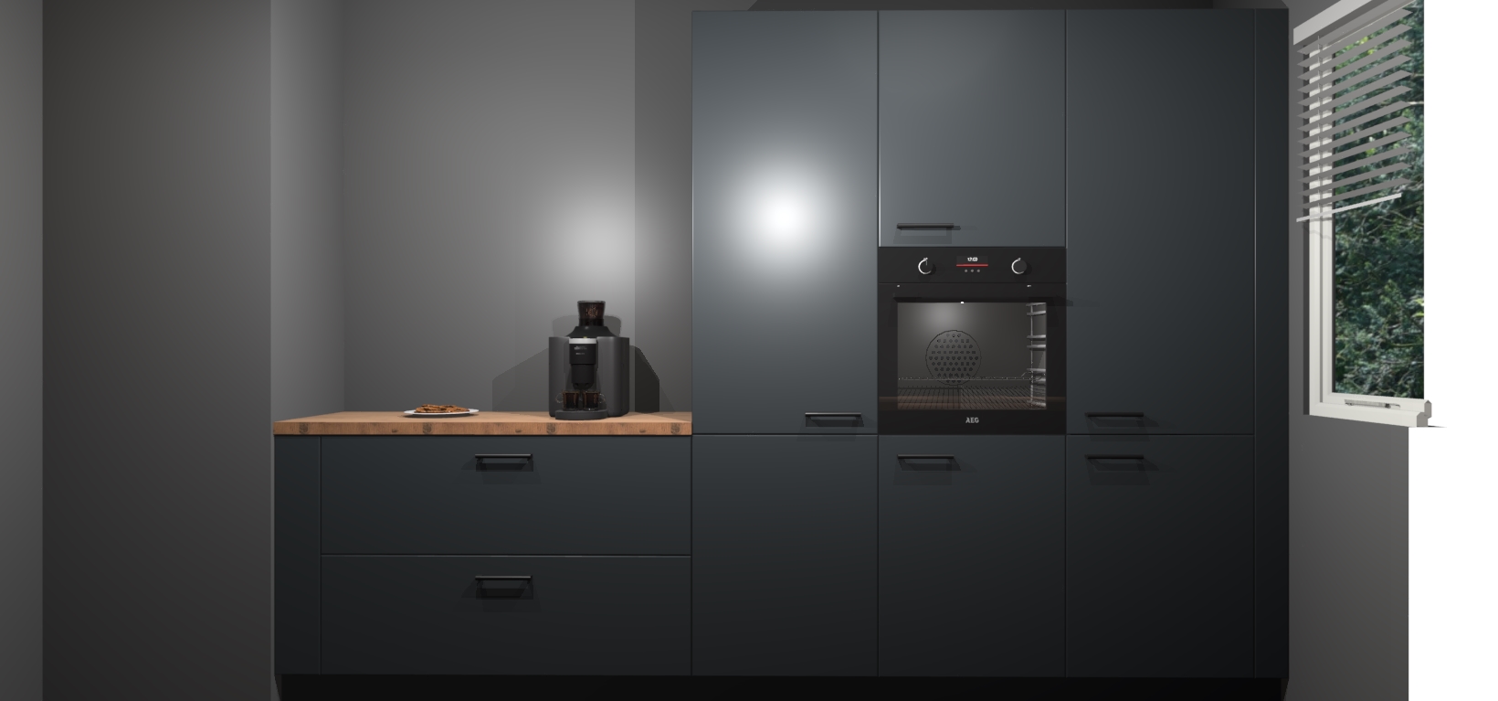 Een stijlvolle en praktische keuken als deze mag gezien worden. Dankzij de prachtige Onyxgrijze matte afwerking wordt de keuken gemakkelijk het middelpunt van uw huis - hij ziet er geweldig uit onder allerlei lichtomstandigheden, van dag tot nacht!