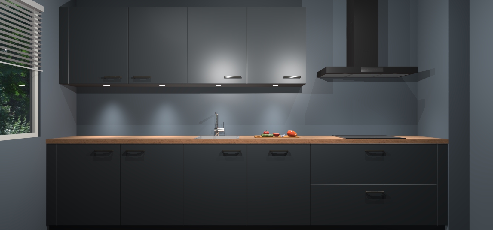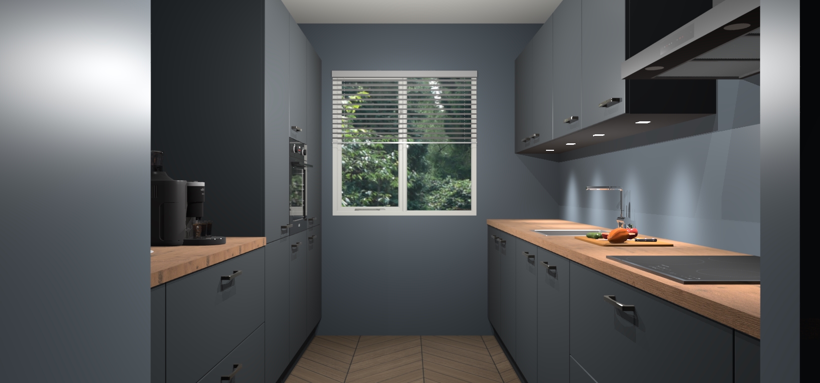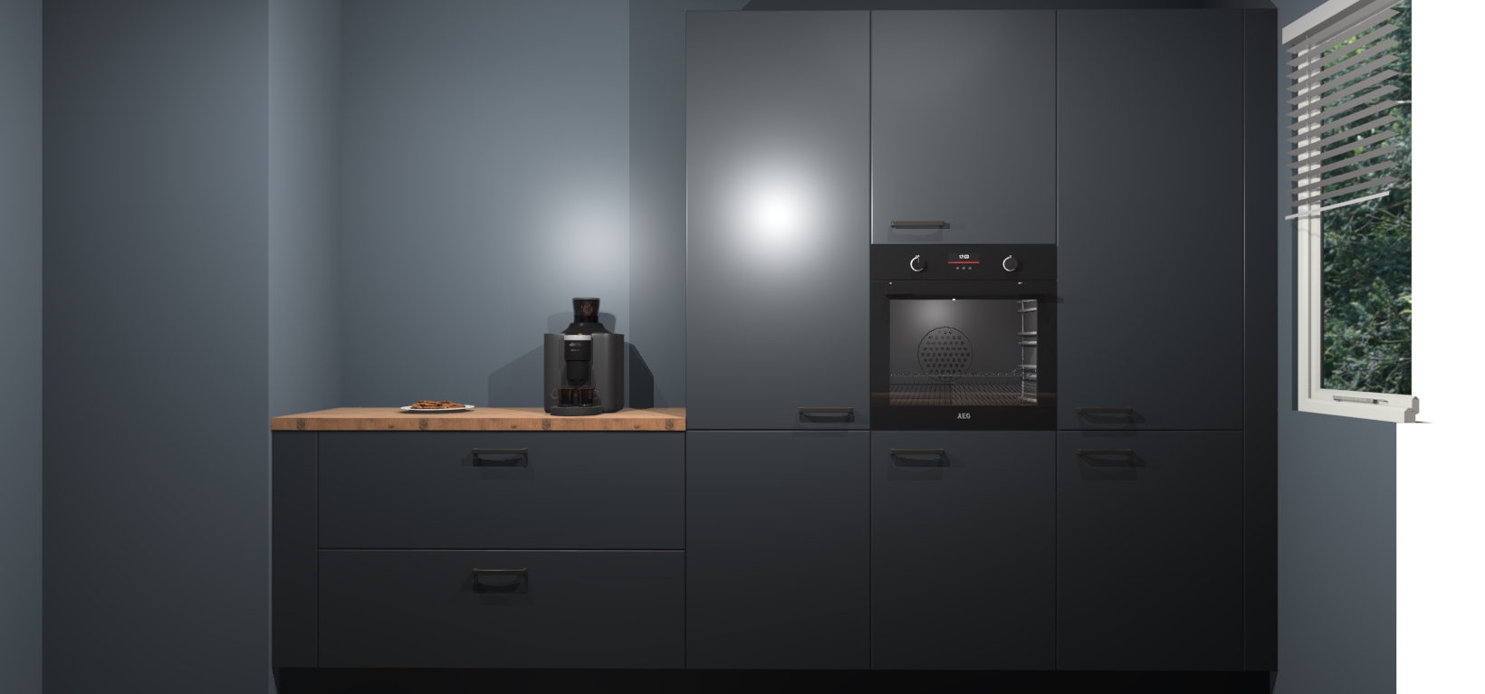 Een stijlvolle en praktische keuken als deze mag gezien worden. Dankzij de prachtige Onyxgrijze matte afwerking wordt de keuken gemakkelijk het middelpunt van uw huis - hij ziet er geweldig uit onder allerlei lichtomstandigheden, van dag tot nacht!