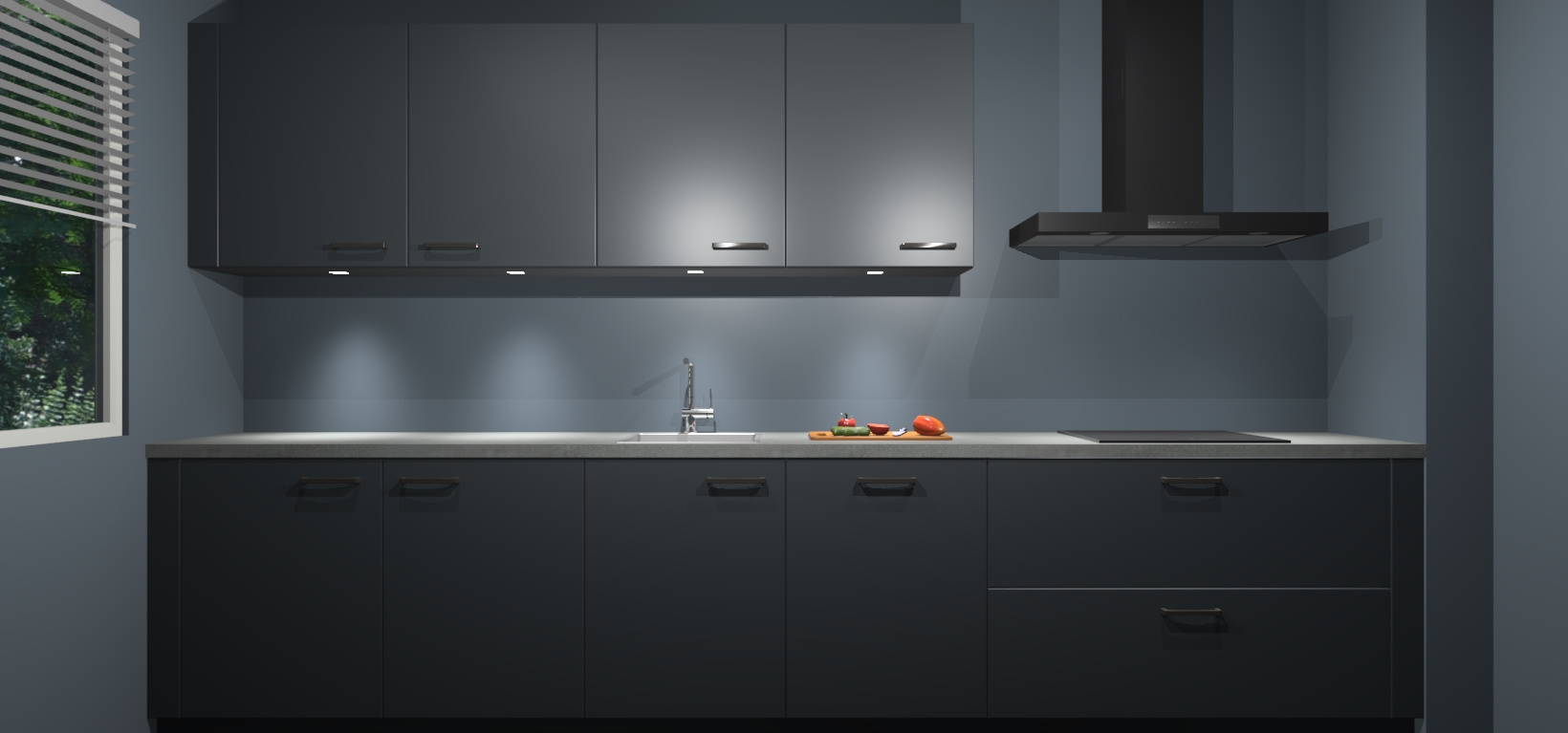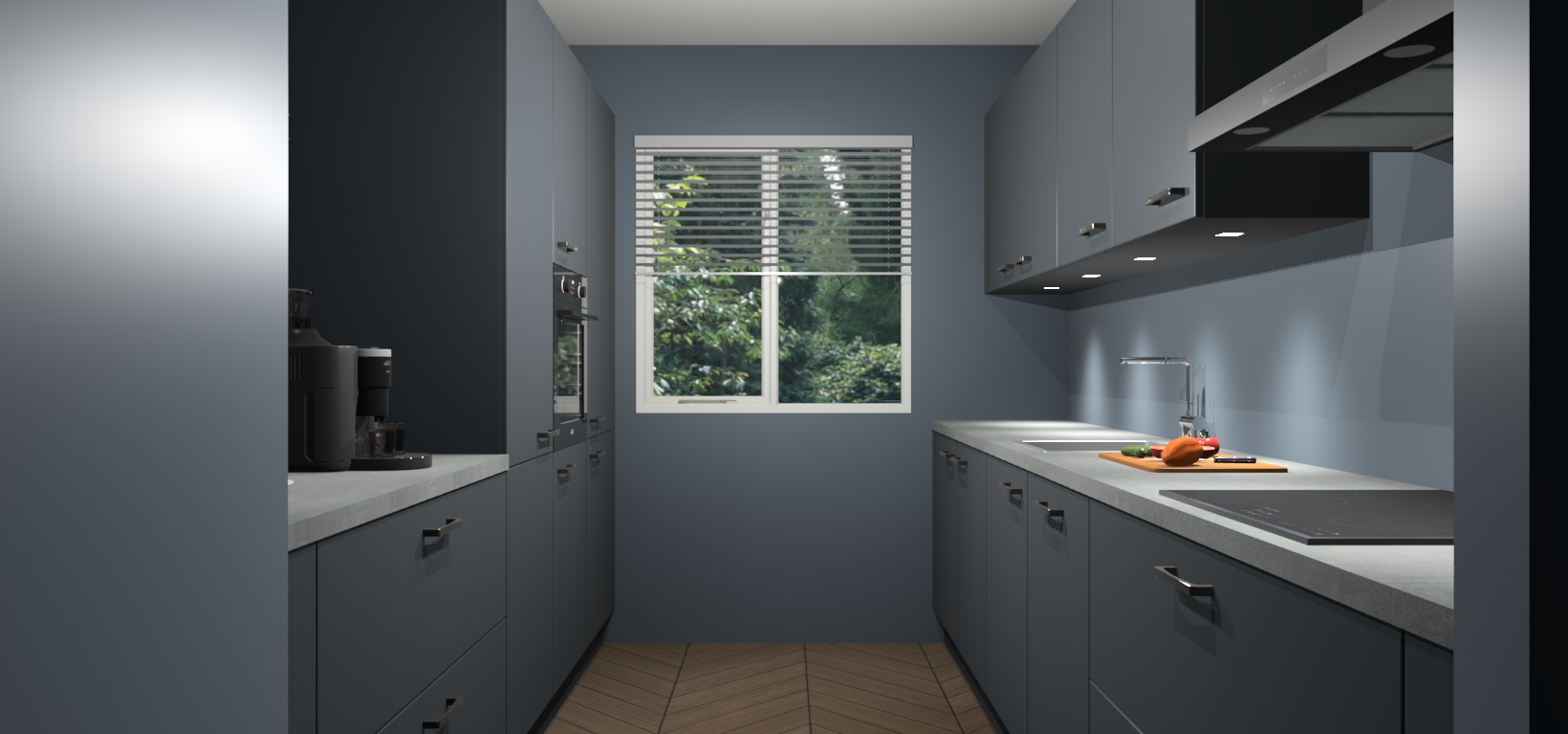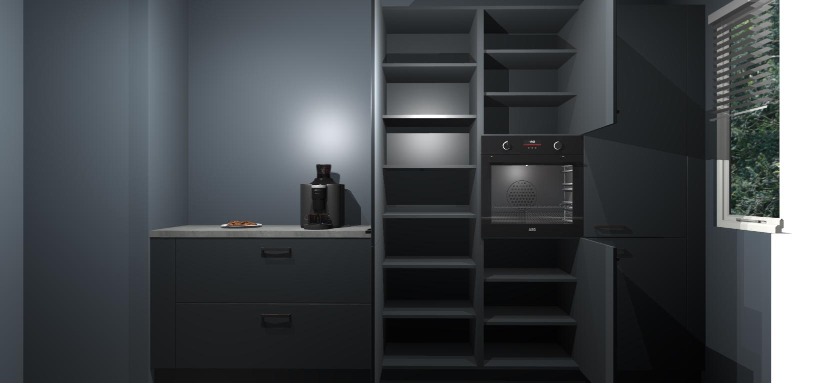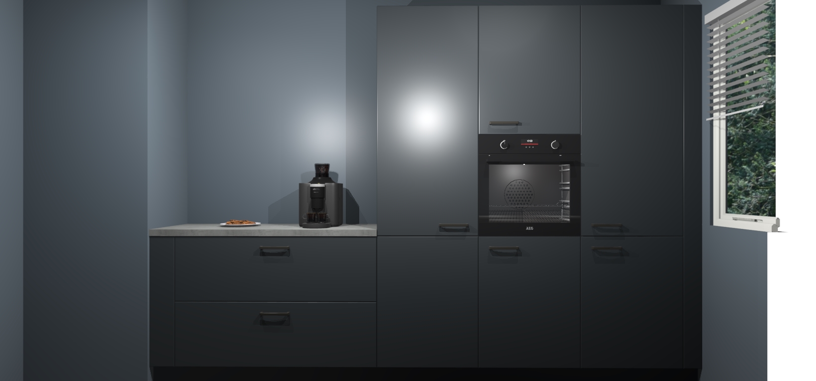 Een stijlvolle en praktische keuken als deze mag gezien worden. Dankzij de prachtige Onyxgrijze matte afwerking wordt de keuken gemakkelijk het middelpunt van uw huis - hij ziet er geweldig uit onder allerlei lichtomstandigheden, van dag tot nacht!