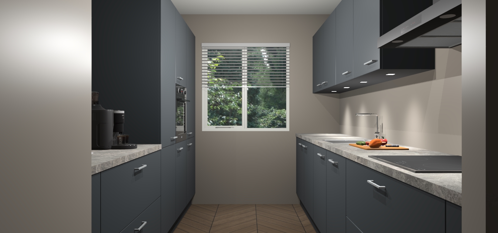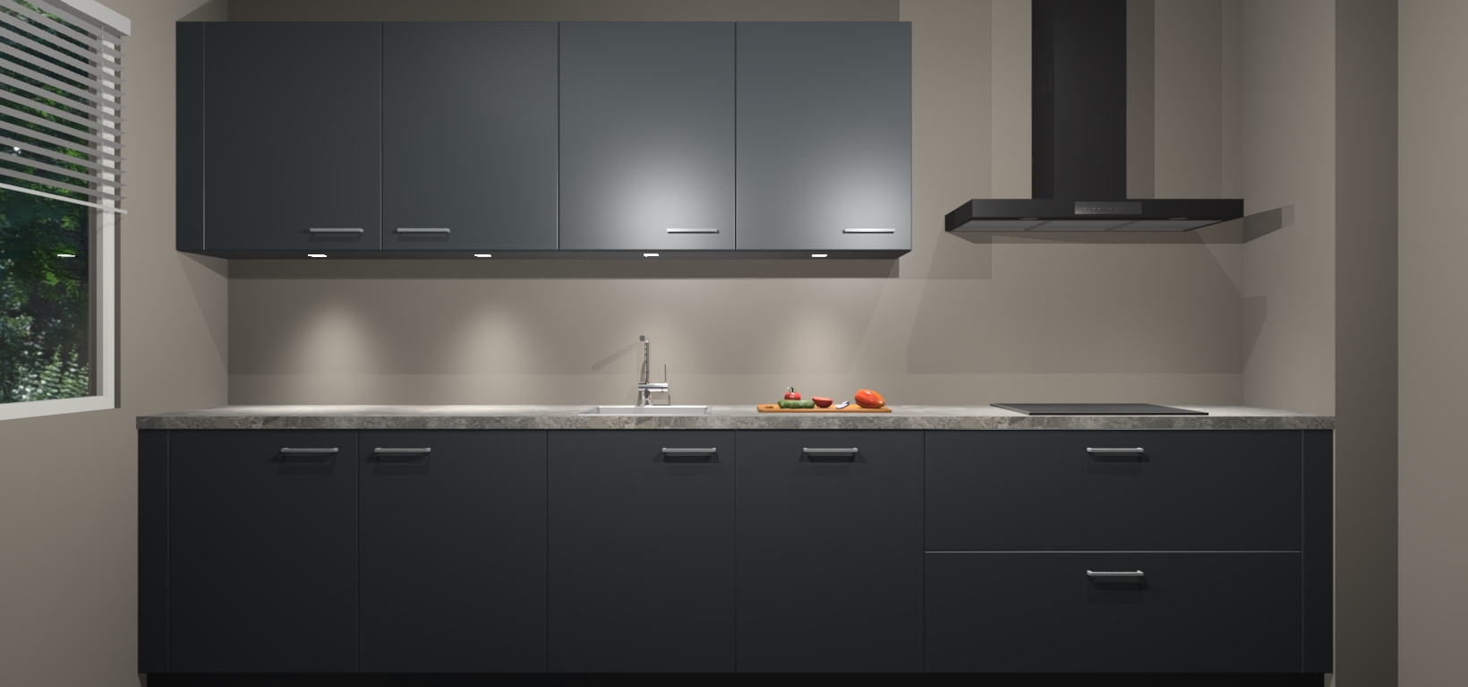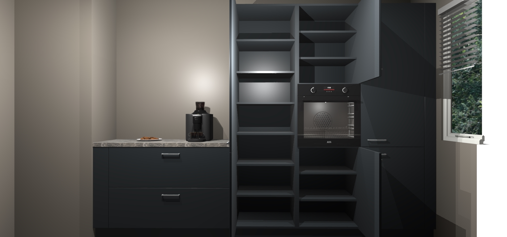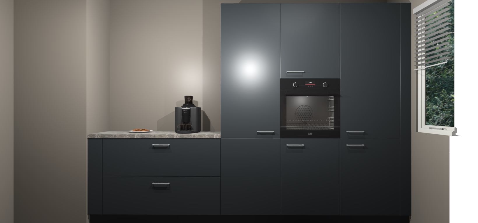 Een stijlvolle en praktische keuken als deze mag gezien worden. Dankzij de prachtige Onyxgrijze matte afwerking wordt de keuken gemakkelijk het middelpunt van uw huis - hij ziet er geweldig uit onder allerlei lichtomstandigheden, van dag tot nacht!
