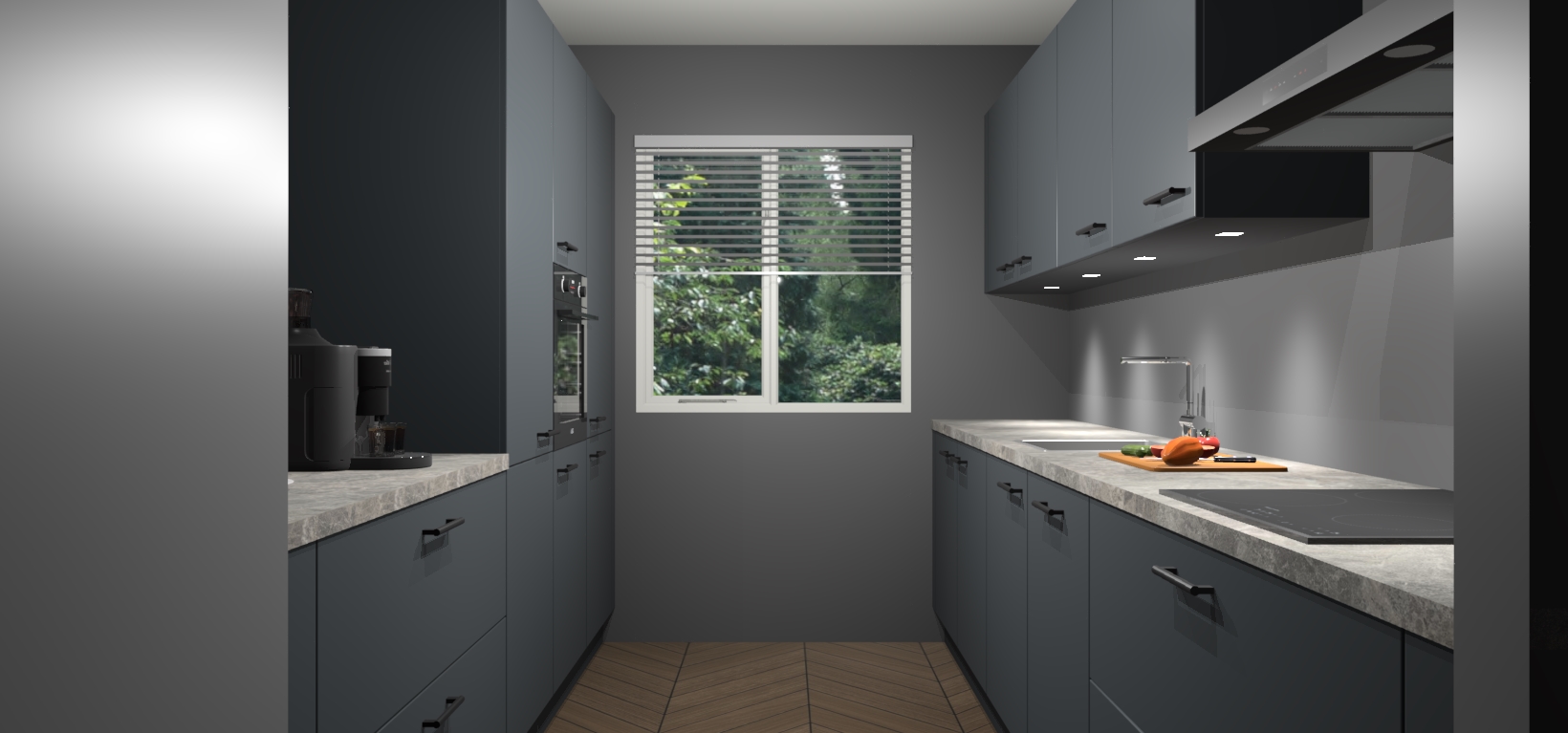 Een stijlvolle en praktische keuken als deze mag gezien worden. Dankzij de prachtige Onyxgrijze matte afwerking wordt de keuken gemakkelijk het middelpunt van uw huis - hij ziet er geweldig uit onder allerlei lichtomstandigheden, van dag tot nacht!