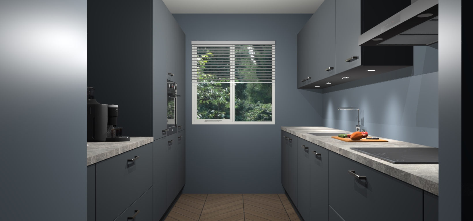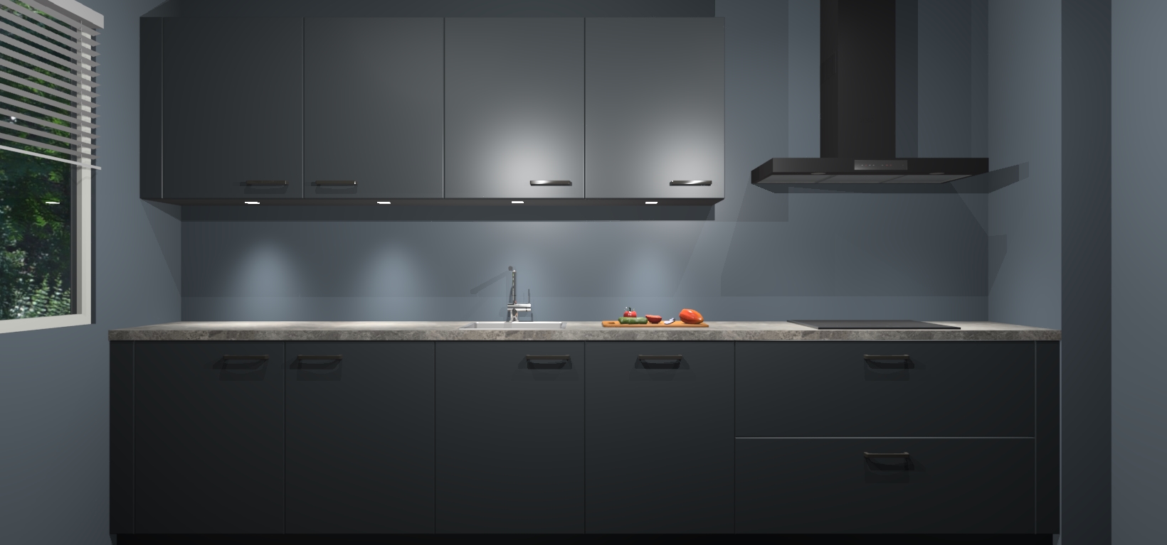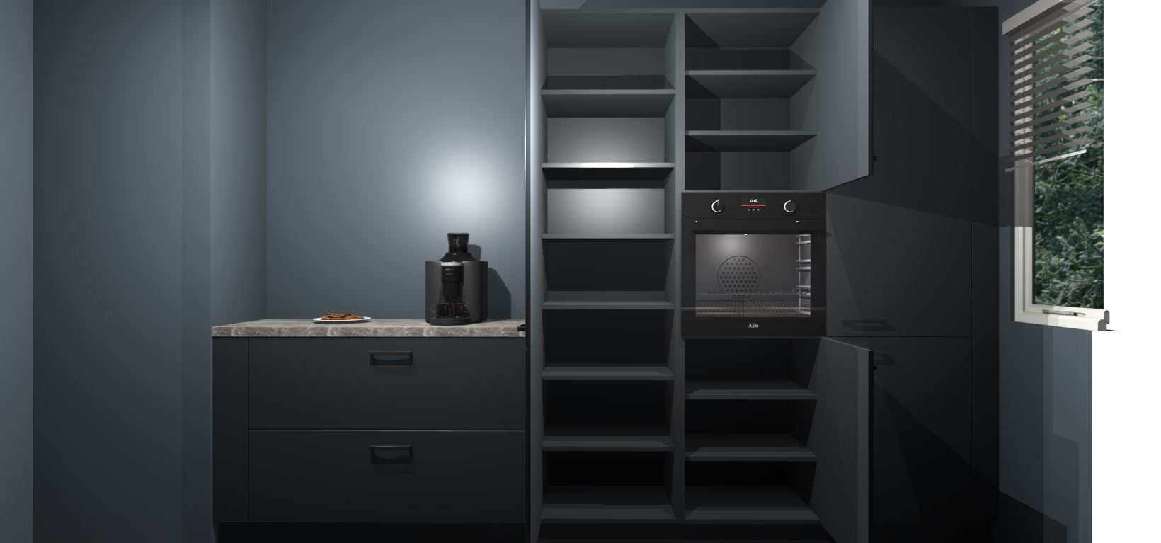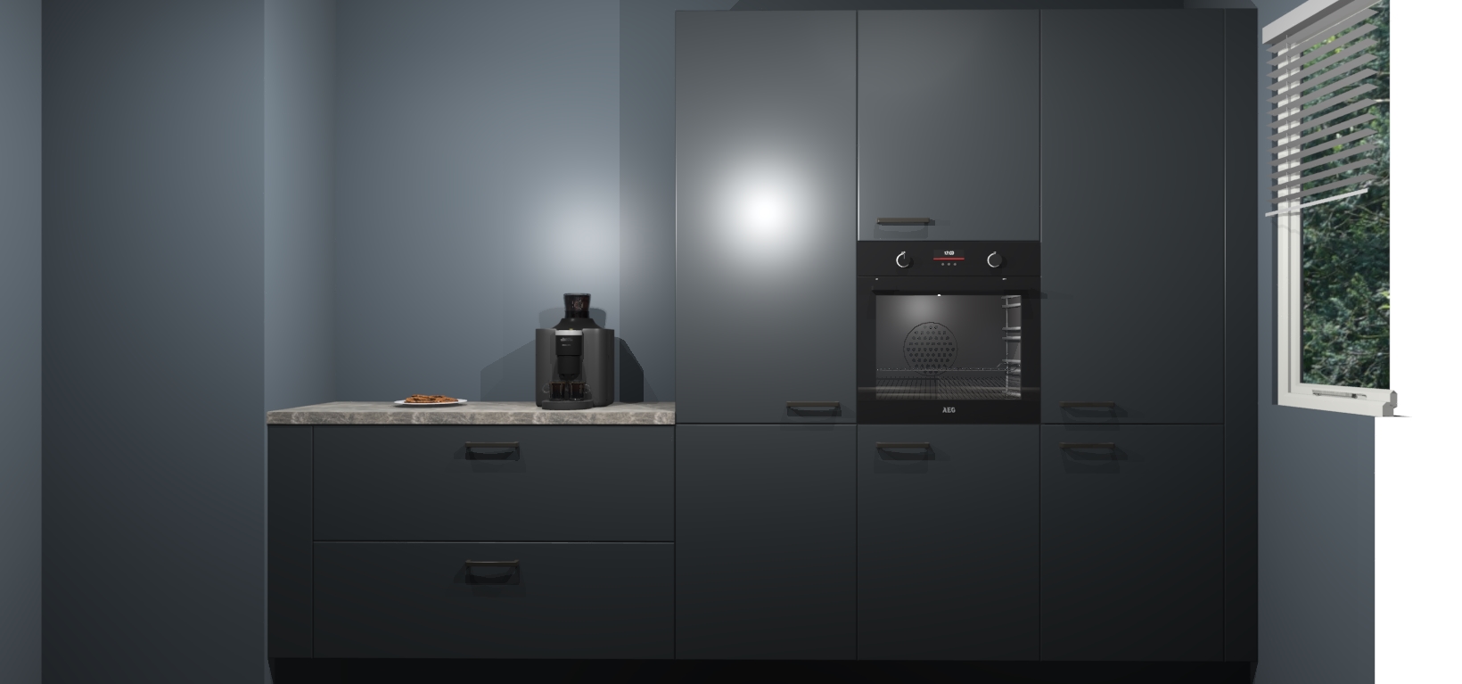 Een stijlvolle en praktische keuken als deze mag gezien worden. Dankzij de prachtige Onyxgrijze matte afwerking wordt de keuken gemakkelijk het middelpunt van uw huis - hij ziet er geweldig uit onder allerlei lichtomstandigheden, van dag tot nacht!
