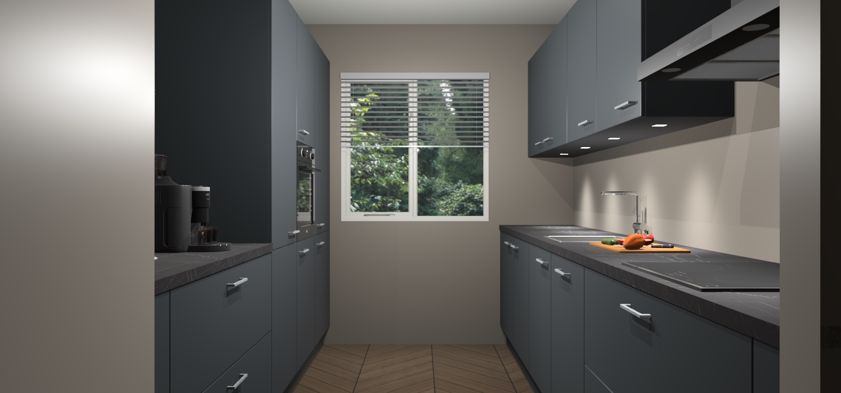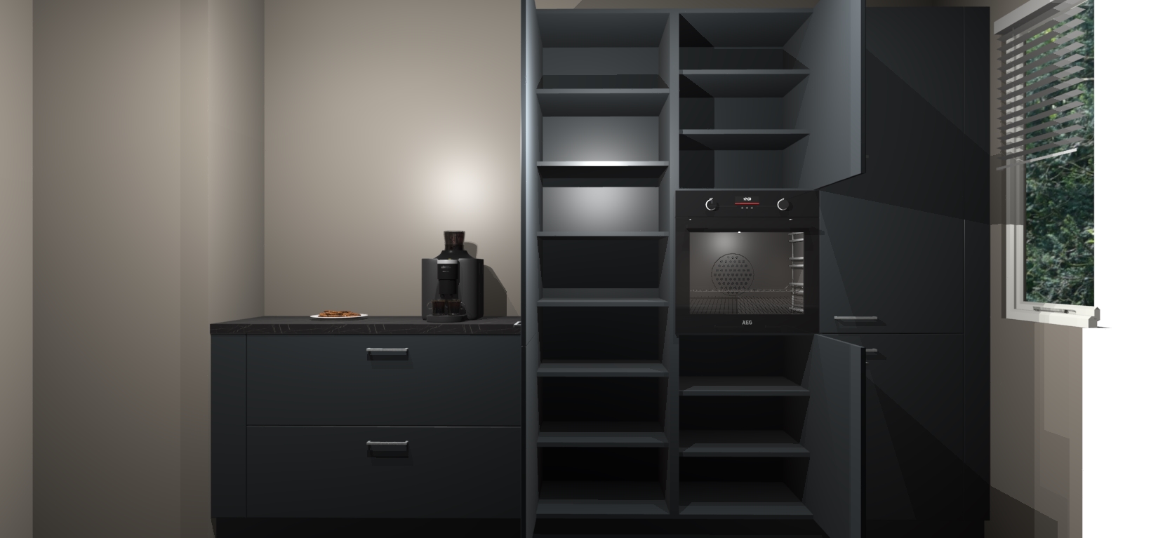 Een stijlvolle en praktische keuken als deze mag gezien worden. Dankzij de prachtige Onyxgrijze matte afwerking wordt de keuken gemakkelijk het middelpunt van uw huis - hij ziet er geweldig uit onder allerlei lichtomstandigheden, van dag tot nacht!