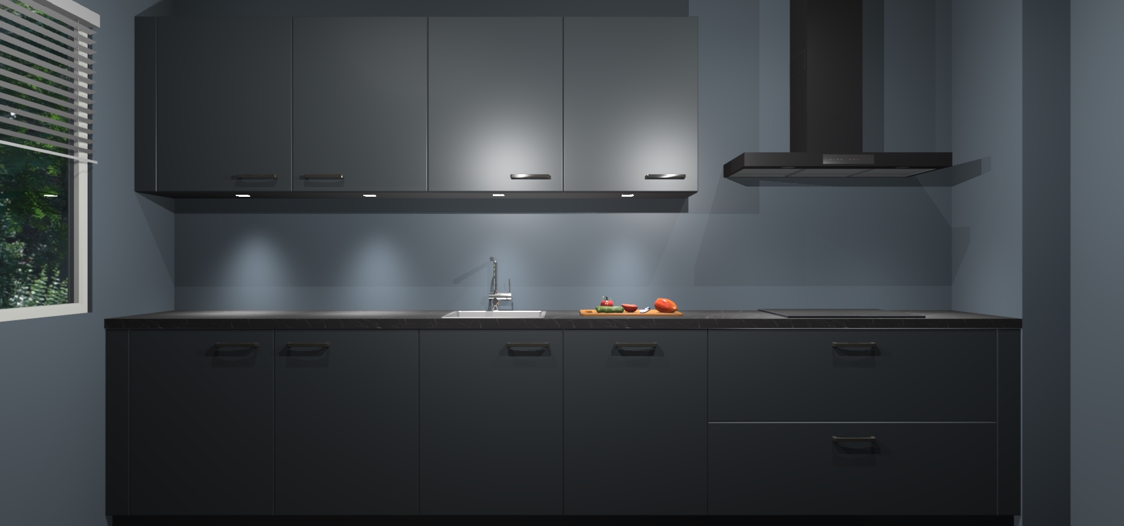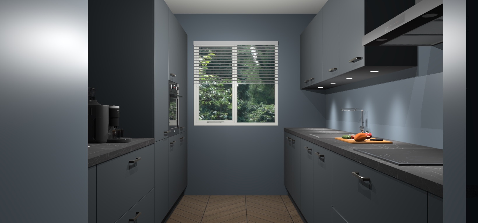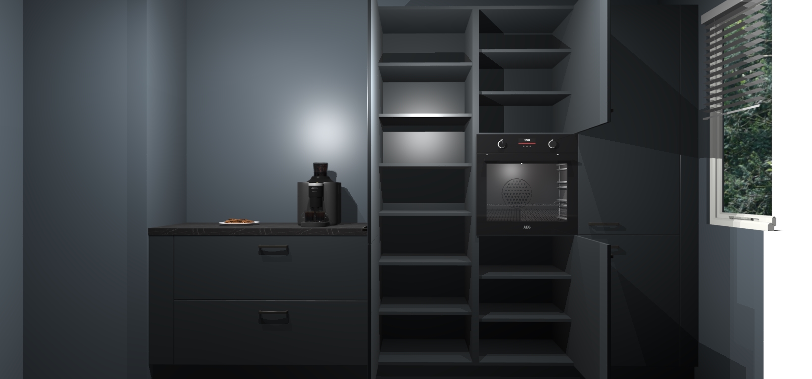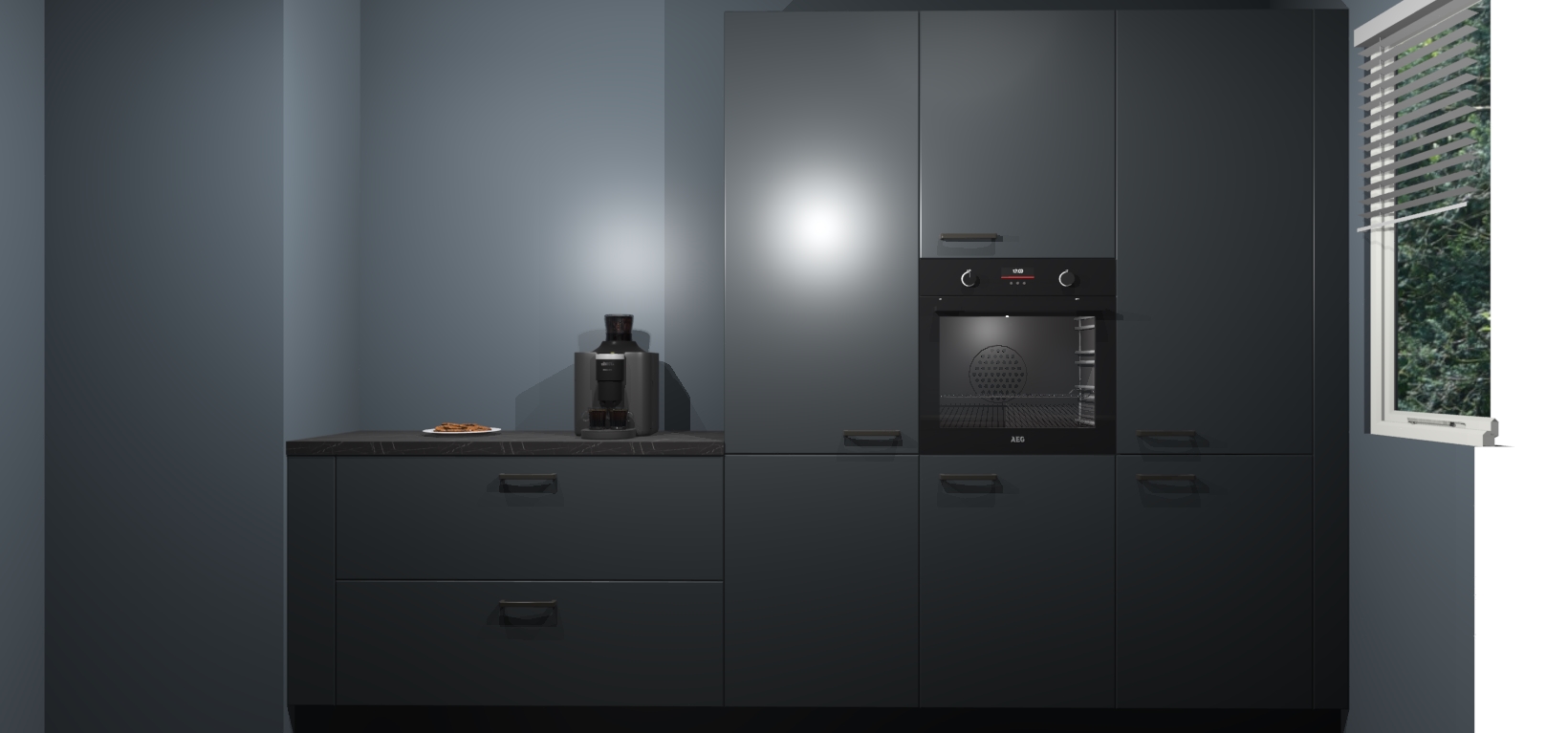 Een stijlvolle en praktische keuken als deze mag gezien worden. Dankzij de prachtige Onyxgrijze matte afwerking wordt de keuken gemakkelijk het middelpunt van uw huis - hij ziet er geweldig uit onder allerlei lichtomstandigheden, van dag tot nacht!