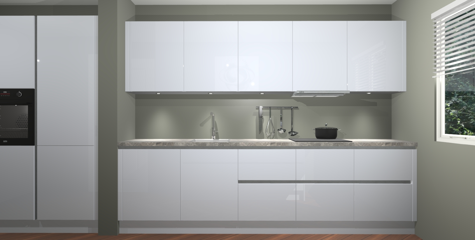 Welkom bij de Sneeuwwitte hoogglans greeploze keuken Engelberg. Deze prachtige keuken zal de komende jaren het middelpunt van de belangstelling in uw huis zijn. Uitgerust met vijf inbouwapparaten komt u nooit kookgereedschap tekort.