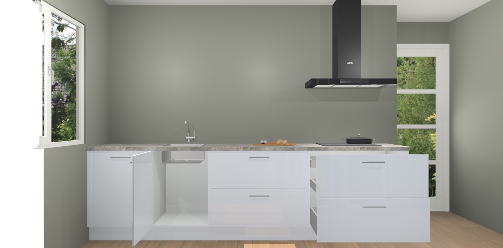 De softclose deuren openen en sluiten is ook heel eenvoudig - geniet van een moeiteloze keukenervaring, zelfs als er kinderen rondlopen. Voor extra gemak bij het plaatsen van uw bestelling bieden we ook een upgrade naar een kookplaat met geïntegreerde afzuiging.