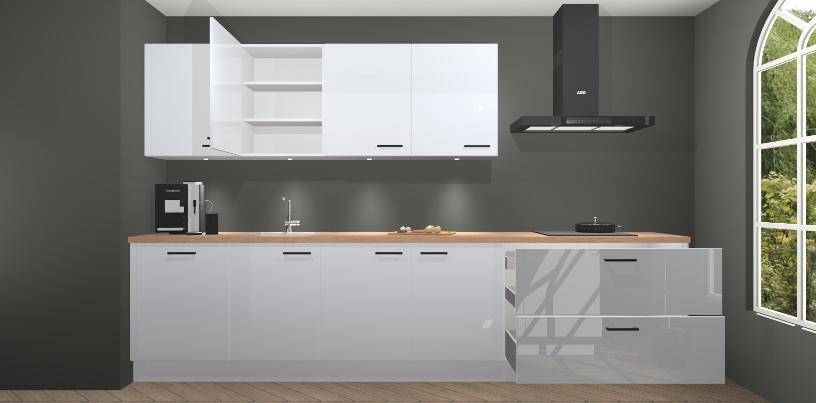 De softclose deuren openen en sluiten is ook heel eenvoudig - geniet van een moeiteloze keukenervaring, zelfs als er kinderen rondlopen. Voor extra gemak bij het plaatsen van uw bestelling bieden we ook een upgrade naar een kookplaat met geïntegreerde afzuiging.