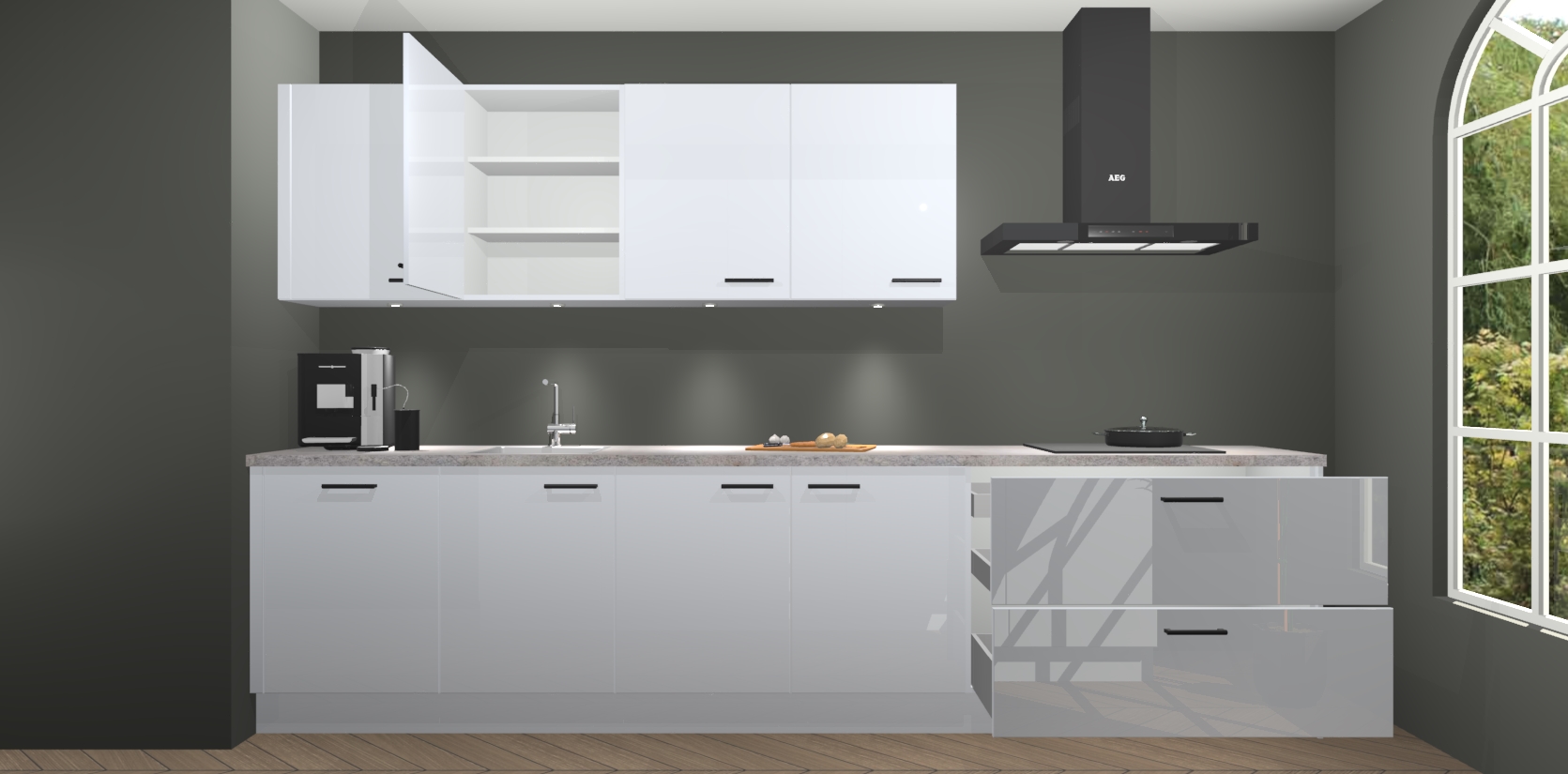 De softclose deuren openen en sluiten is ook heel eenvoudig - geniet van een moeiteloze keukenervaring, zelfs als er kinderen rondlopen. Voor extra gemak bij het plaatsen van uw bestelling bieden we ook een upgrade naar een kookplaat met geïntegreerde afzuiging.