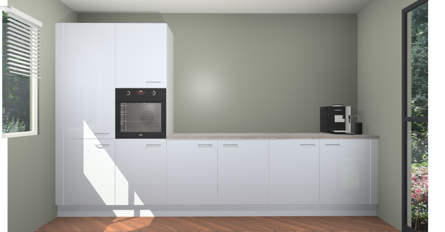 Welkom bij de Sneeuwwitte hoogglans keuken Lusaka. Deze prachtige keuken zal de komende jaren het middelpunt van de belangstelling in uw huis zijn. Uitgerust met vijf inbouwapparaten komt u nooit kookgereedschap tekort. Bovendien geeft de warme houtlook elke ruimte een uitnodigende en tijdloze uitstraling.