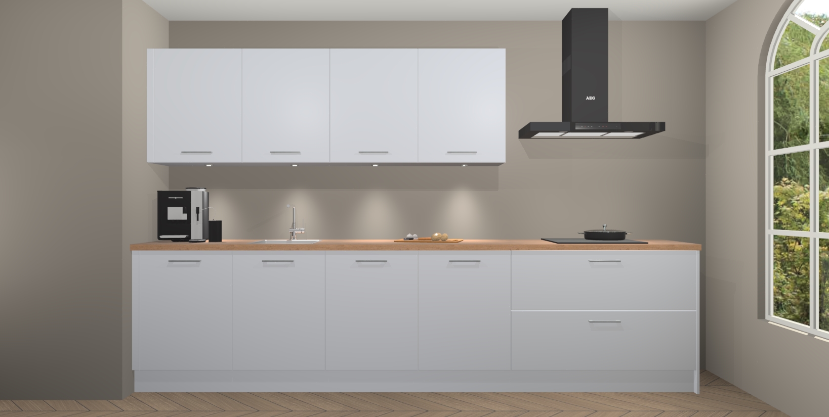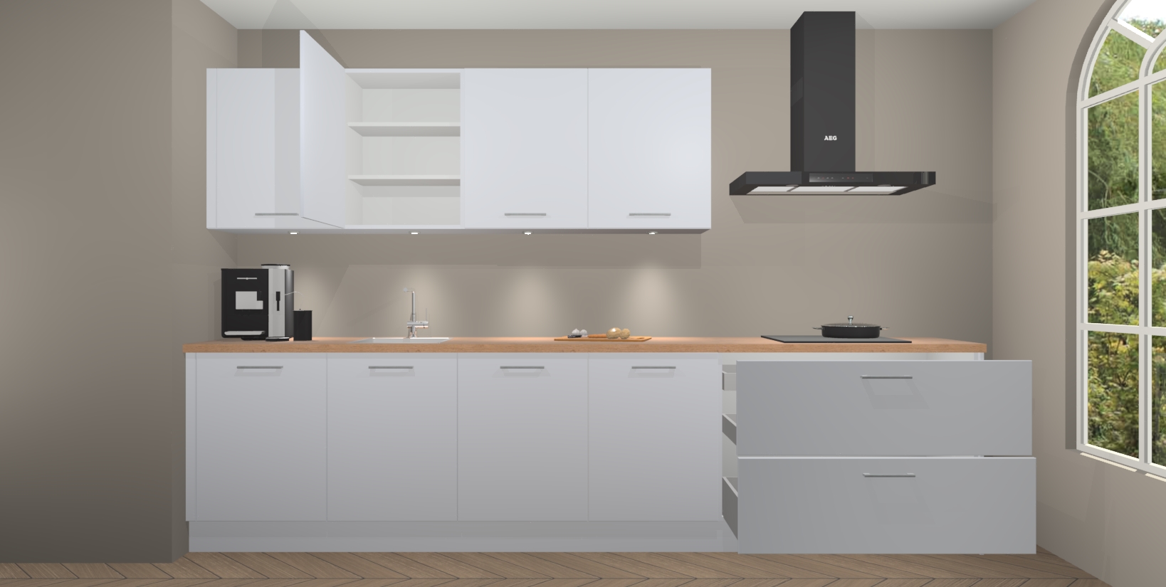De softclose deuren openen en sluiten is ook heel eenvoudig - geniet van een moeiteloze keukenervaring, zelfs als er kinderen rondlopen. Voor extra gemak bij het plaatsen van uw bestelling bieden we ook een upgrade naar een kookplaat met geïntegreerde afzuiging.