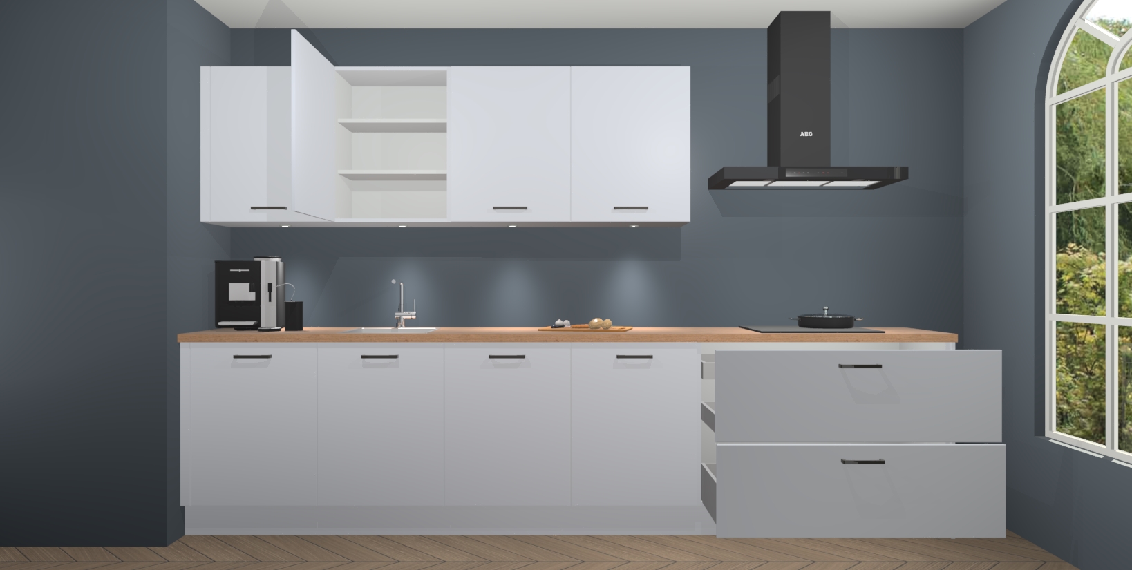 De softclose deuren openen en sluiten is ook heel eenvoudig - geniet van een moeiteloze keukenervaring, zelfs als er kinderen rondlopen. Voor extra gemak bij het plaatsen van uw bestelling bieden we ook een upgrade naar een kookplaat met geïntegreerde afzuiging.