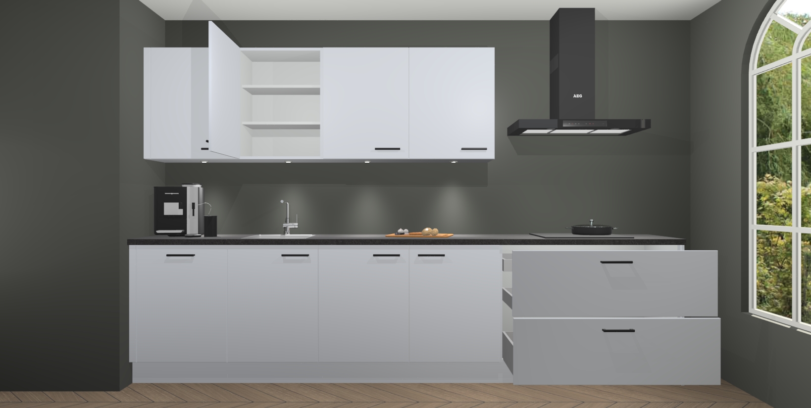 De softclose deuren openen en sluiten is ook heel eenvoudig - geniet van een moeiteloze keukenervaring, zelfs als er kinderen rondlopen. Voor extra gemak bij het plaatsen van uw bestelling bieden we ook een upgrade naar een kookplaat met geïntegreerde afzuiging.