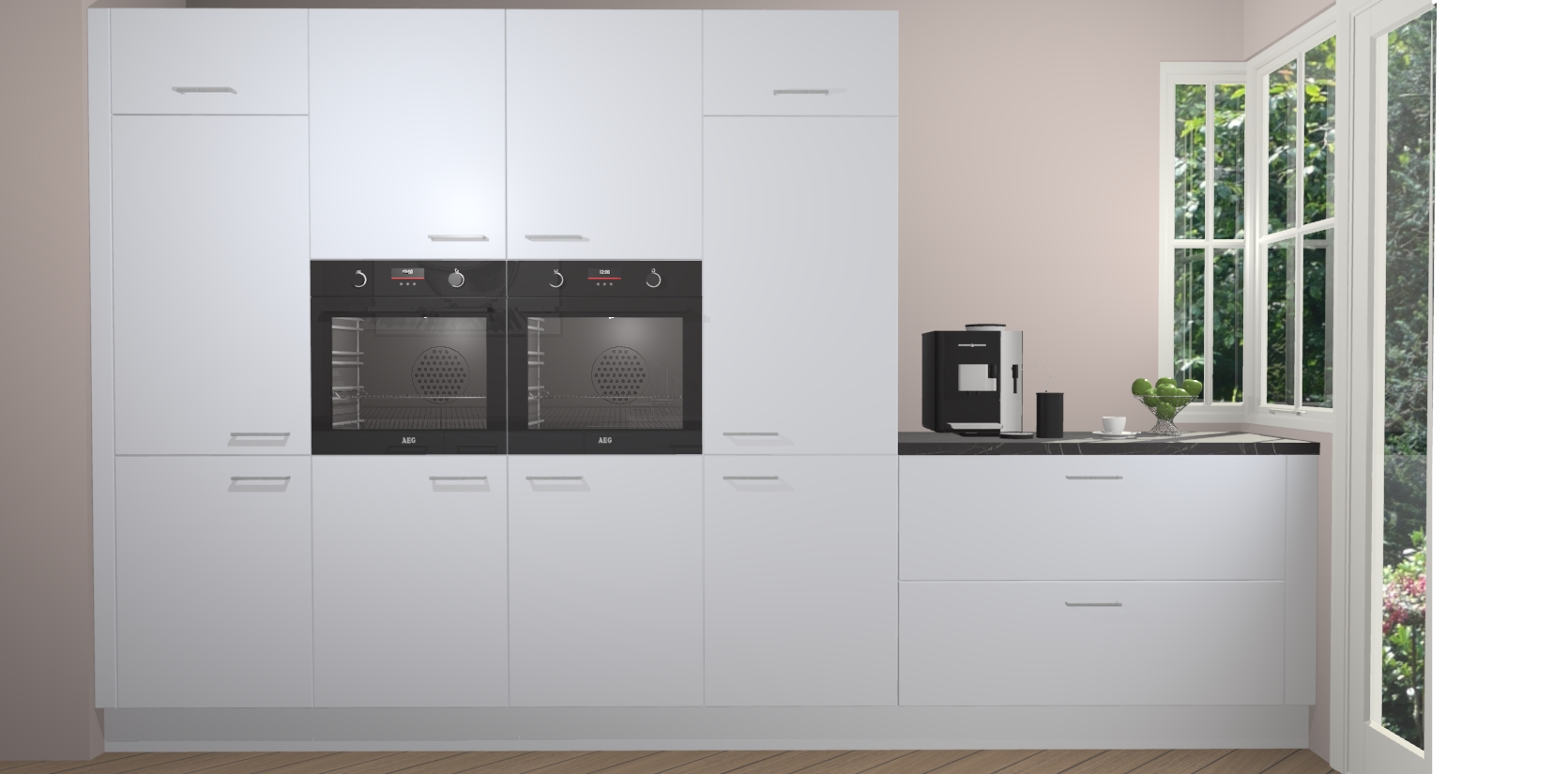 Een stijlvolle en praktische keuken als deze mag gezien worden. Dankzij de prachtige sneeuwwitte matte afwerking wordt de keuken gemakkelijk het middelpunt van uw huis - hij ziet er geweldig uit onder allerlei lichtomstandigheden, van dag tot nacht!