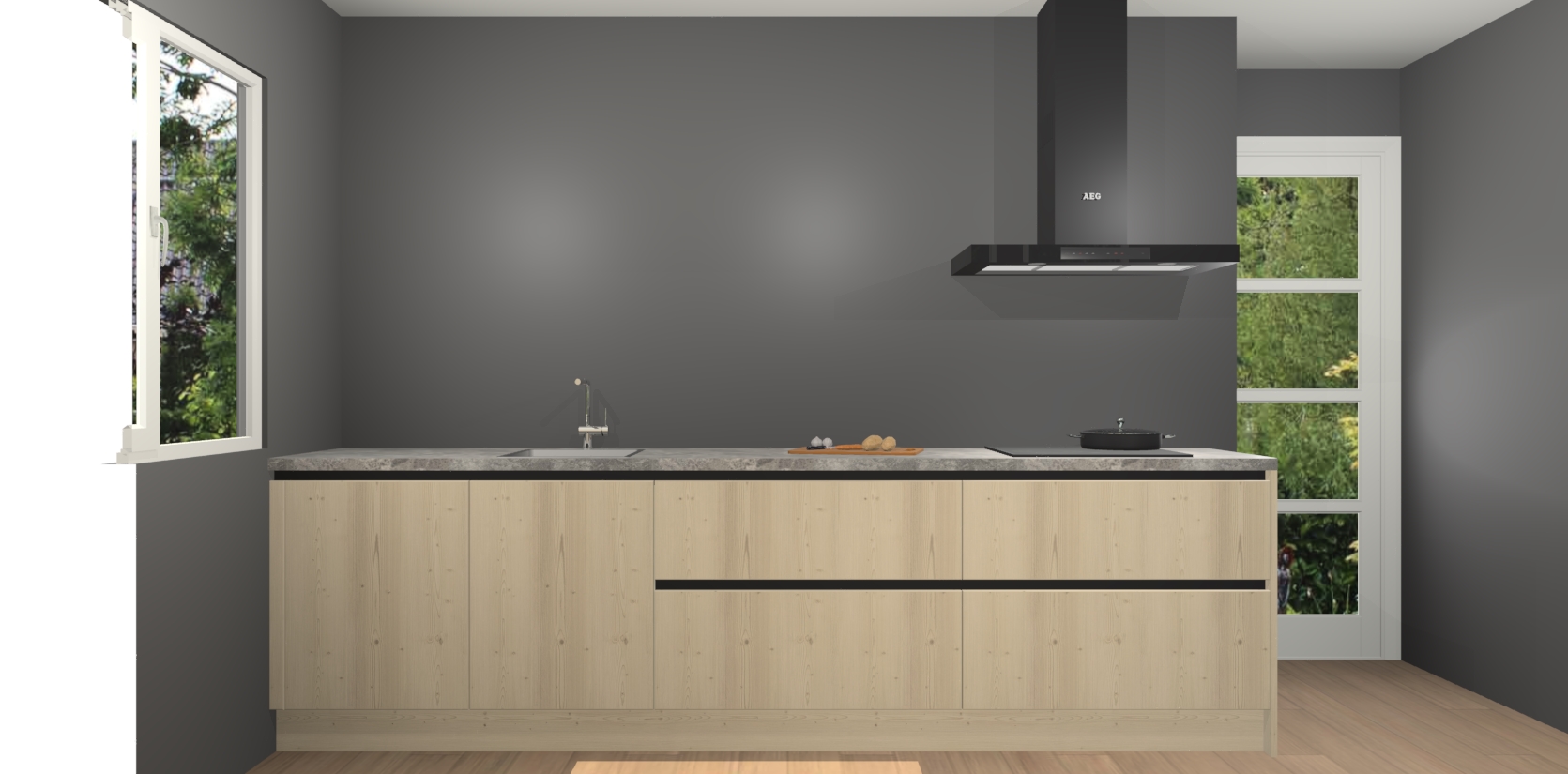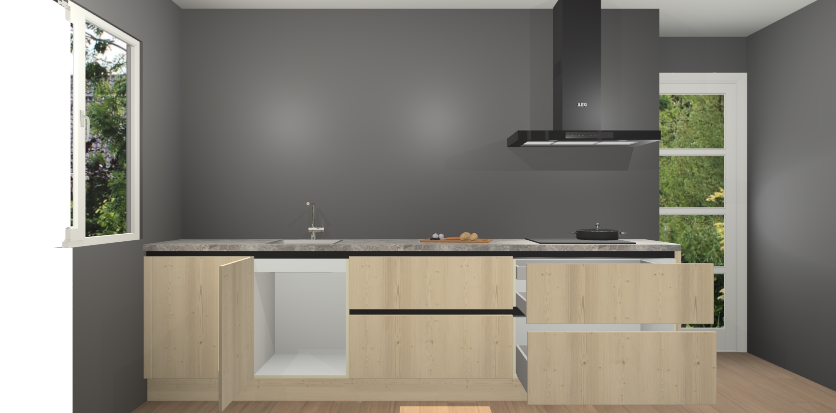 De softclose deuren openen en sluiten is ook heel eenvoudig - geniet van een moeiteloze keukenervaring, zelfs als er kinderen rondlopen. Voor extra gemak bij het plaatsen van uw bestelling bieden we ook een upgrade naar een kookplaat met geïntegreerde afzuiging.