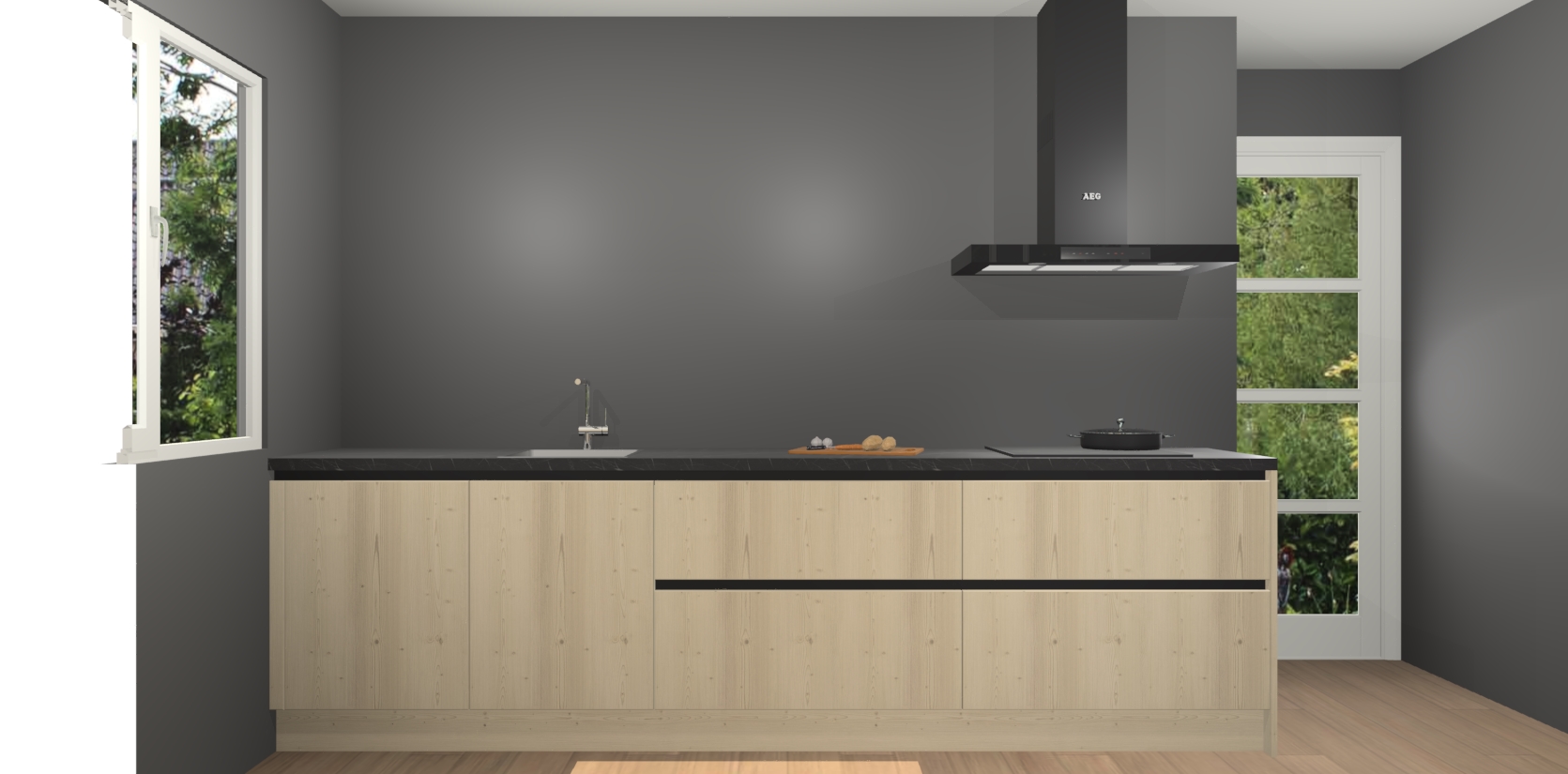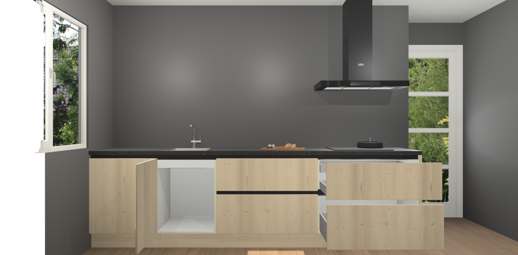 De softclose deuren openen en sluiten is ook heel eenvoudig - geniet van een moeiteloze keukenervaring, zelfs als er kinderen rondlopen. Voor extra gemak bij het plaatsen van uw bestelling bieden we ook een upgrade naar een kookplaat met geïntegreerde afzuiging.