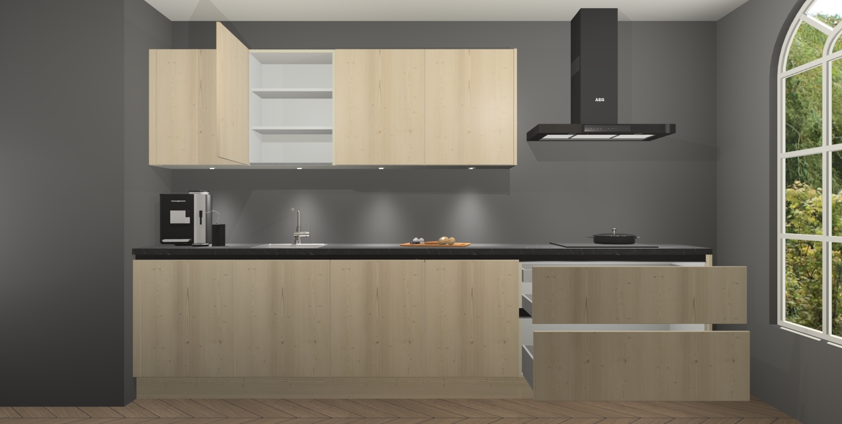 De softclose deuren openen en sluiten is ook heel eenvoudig - geniet van een moeiteloze keukenervaring, zelfs als er kinderen rondlopen. Voor extra gemak bij het plaatsen van uw bestelling bieden we ook een upgrade naar een kookplaat met geïntegreerde afzuiging.