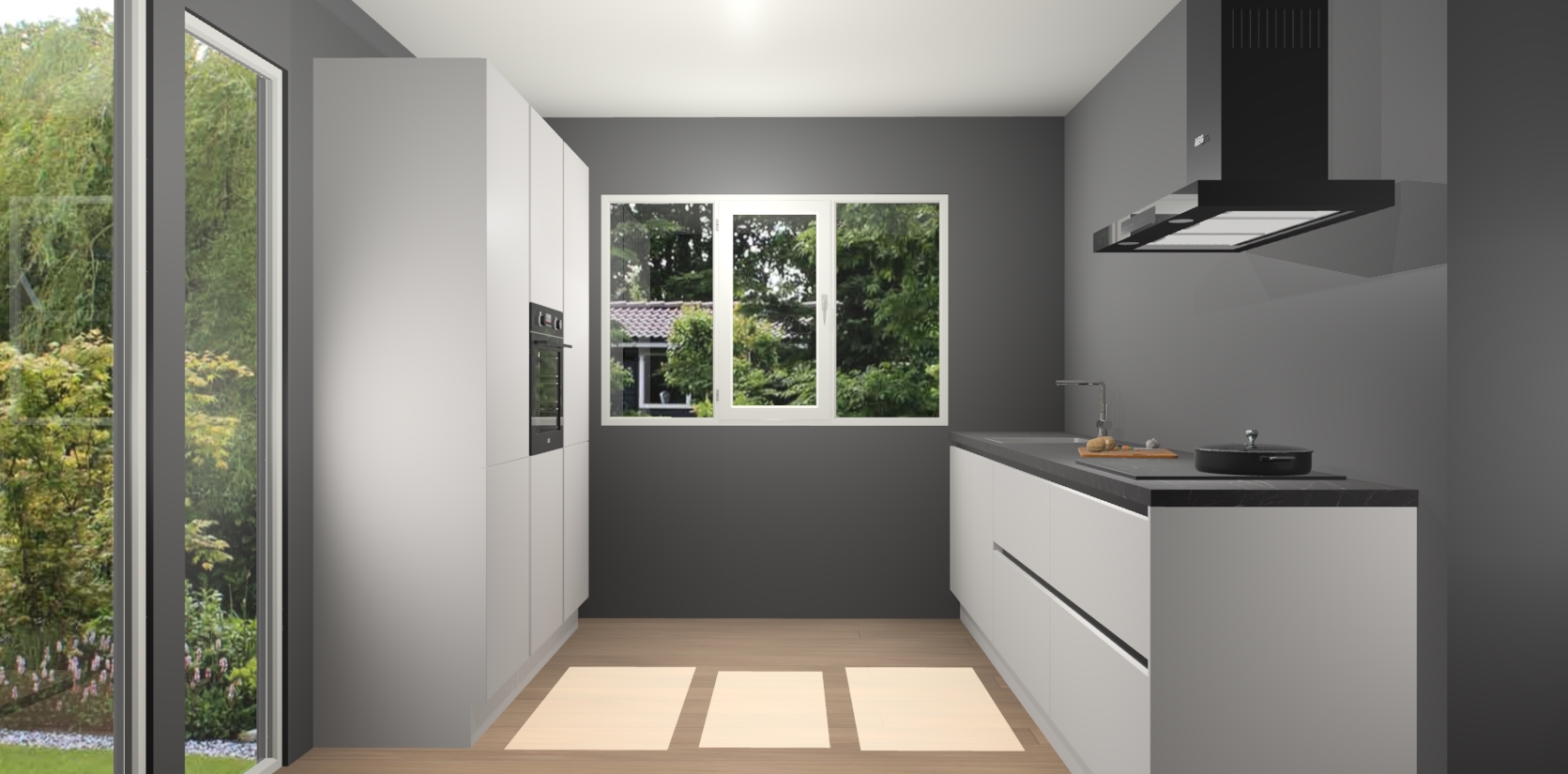 De softclose deuren openen en sluiten is ook heel eenvoudig - geniet van een moeiteloze keukenervaring, zelfs als er kinderen rondlopen. Voor extra gemak bij het plaatsen van uw bestelling bieden we ook een upgrade naar een kookplaat met geïntegreerde afzuiging.