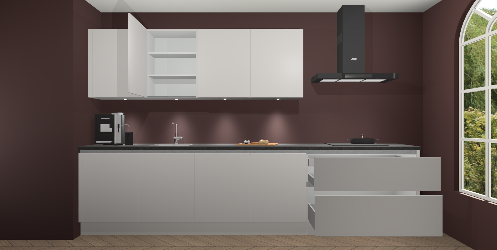 De softclose deuren openen en sluiten is ook heel eenvoudig - geniet van een moeiteloze keukenervaring, zelfs als er kinderen rondlopen. Voor extra gemak bij het plaatsen van uw bestelling bieden we ook een upgrade naar een kookplaat met geïntegreerde afzuiging.