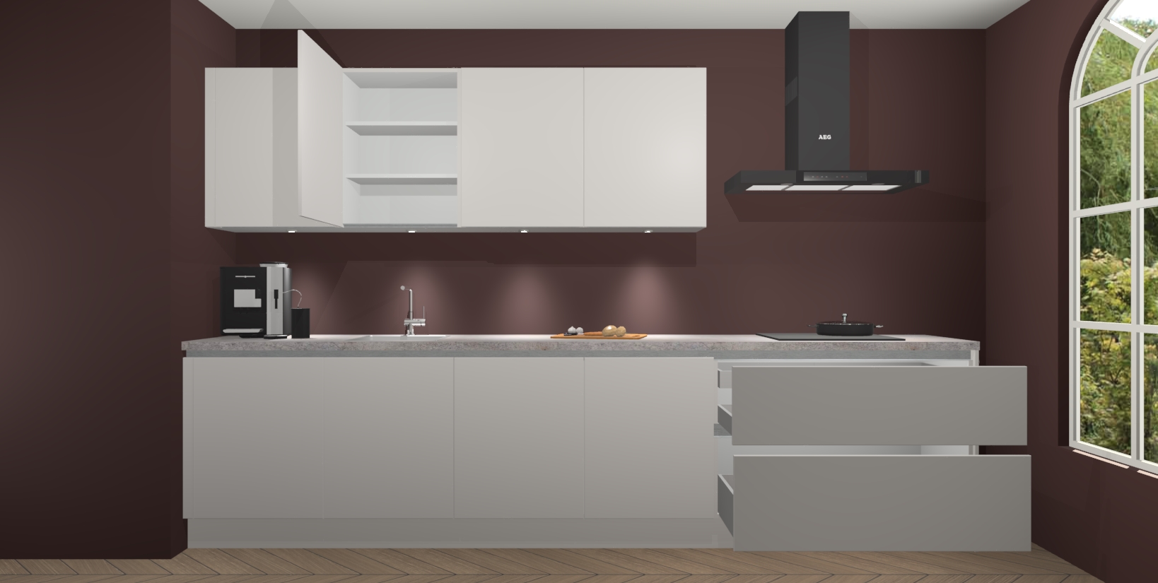 De softclose deuren openen en sluiten is ook heel eenvoudig - geniet van een moeiteloze keukenervaring, zelfs als er kinderen rondlopen. Voor extra gemak bij het plaatsen van uw bestelling bieden we ook een upgrade naar een kookplaat met geïntegreerde afzuiging.