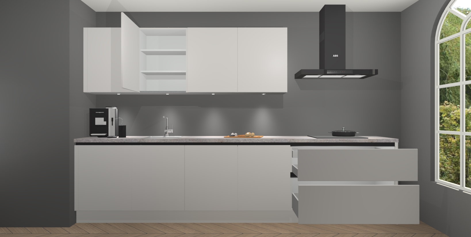 De softclose deuren openen en sluiten is ook heel eenvoudig - geniet van een moeiteloze keukenervaring, zelfs als er kinderen rondlopen. Voor extra gemak bij het plaatsen van uw bestelling bieden we ook een upgrade naar een kookplaat met geïntegreerde afzuiging.