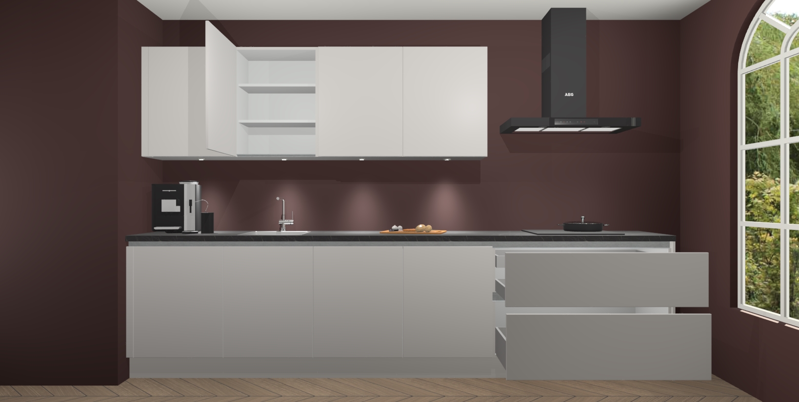 De softclose deuren openen en sluiten is ook heel eenvoudig - geniet van een moeiteloze keukenervaring, zelfs als er kinderen rondlopen. Voor extra gemak bij het plaatsen van uw bestelling bieden we ook een upgrade naar een kookplaat met geïntegreerde afzuiging.