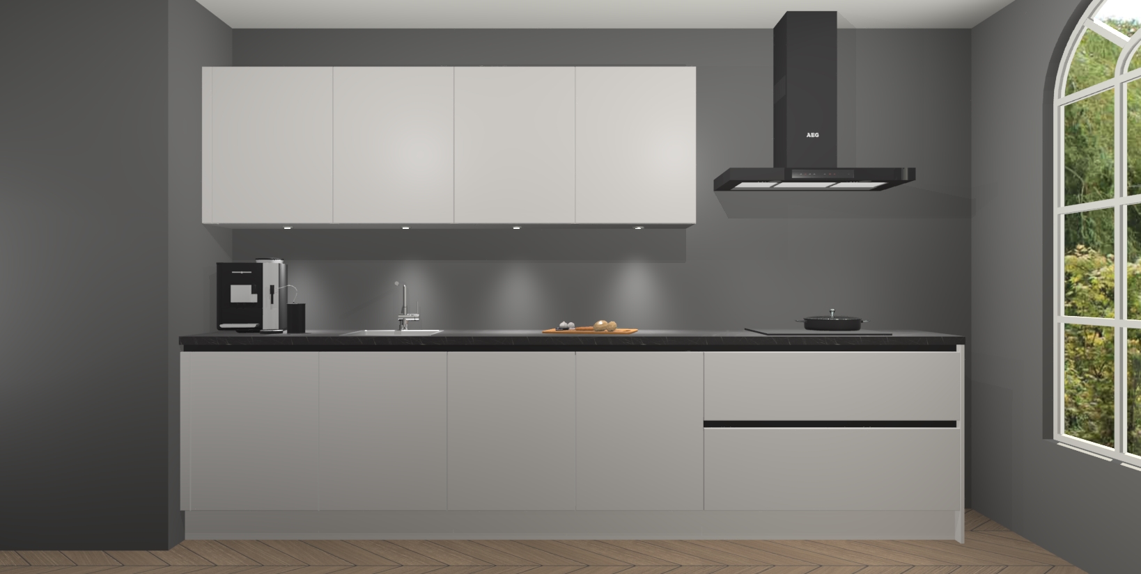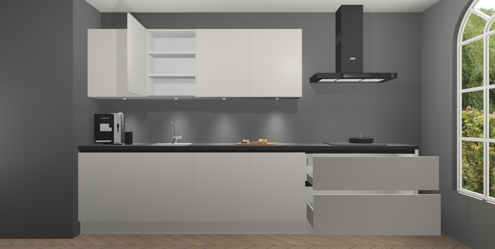 De softclose deuren openen en sluiten is ook heel eenvoudig - geniet van een moeiteloze keukenervaring, zelfs als er kinderen rondlopen. Voor extra gemak bij het plaatsen van uw bestelling bieden we ook een upgrade naar een kookplaat met geïntegreerde afzuiging.
