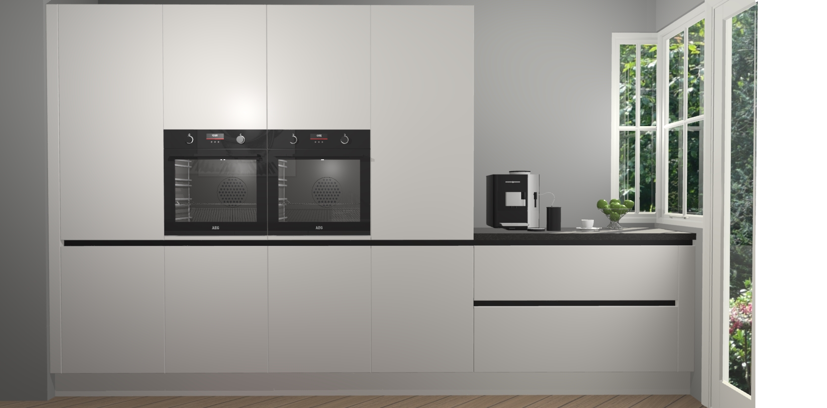 Een stijlvolle en praktische keuken als deze mag gezien worden. Dankzij de prachtige zijdegrijze matte afwerking wordt de keuken gemakkelijk het middelpunt van uw huis - hij ziet er geweldig uit onder allerlei lichtomstandigheden, van dag tot nacht!