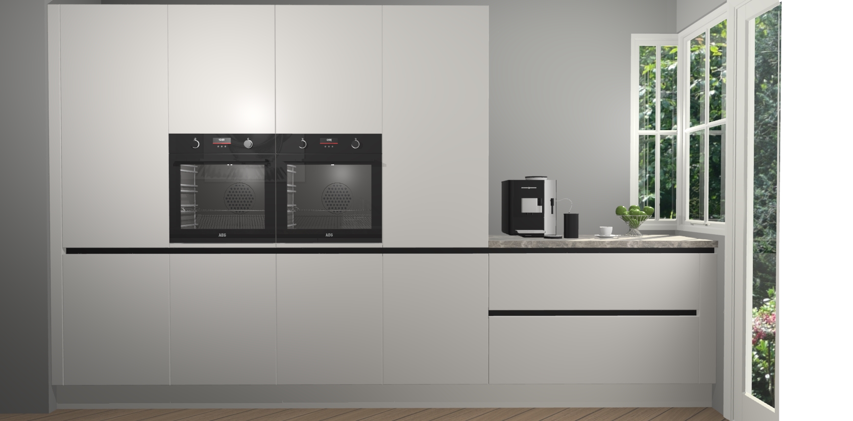 Een stijlvolle en praktische keuken als deze mag gezien worden. Dankzij de prachtige zijdegrijze matte afwerking wordt de keuken gemakkelijk het middelpunt van uw huis - hij ziet er geweldig uit onder allerlei lichtomstandigheden, van dag tot nacht!