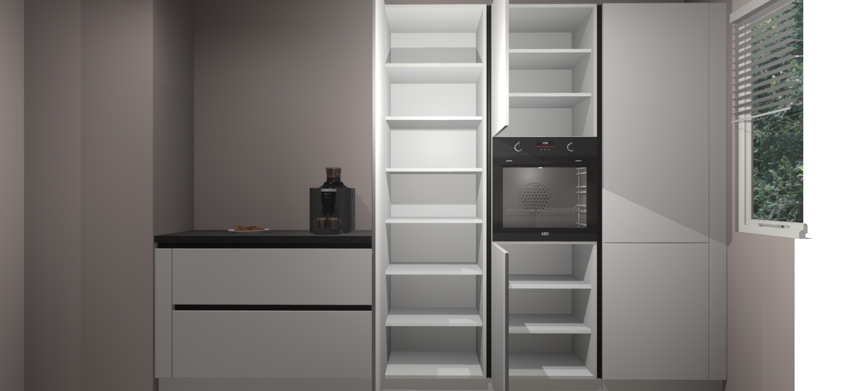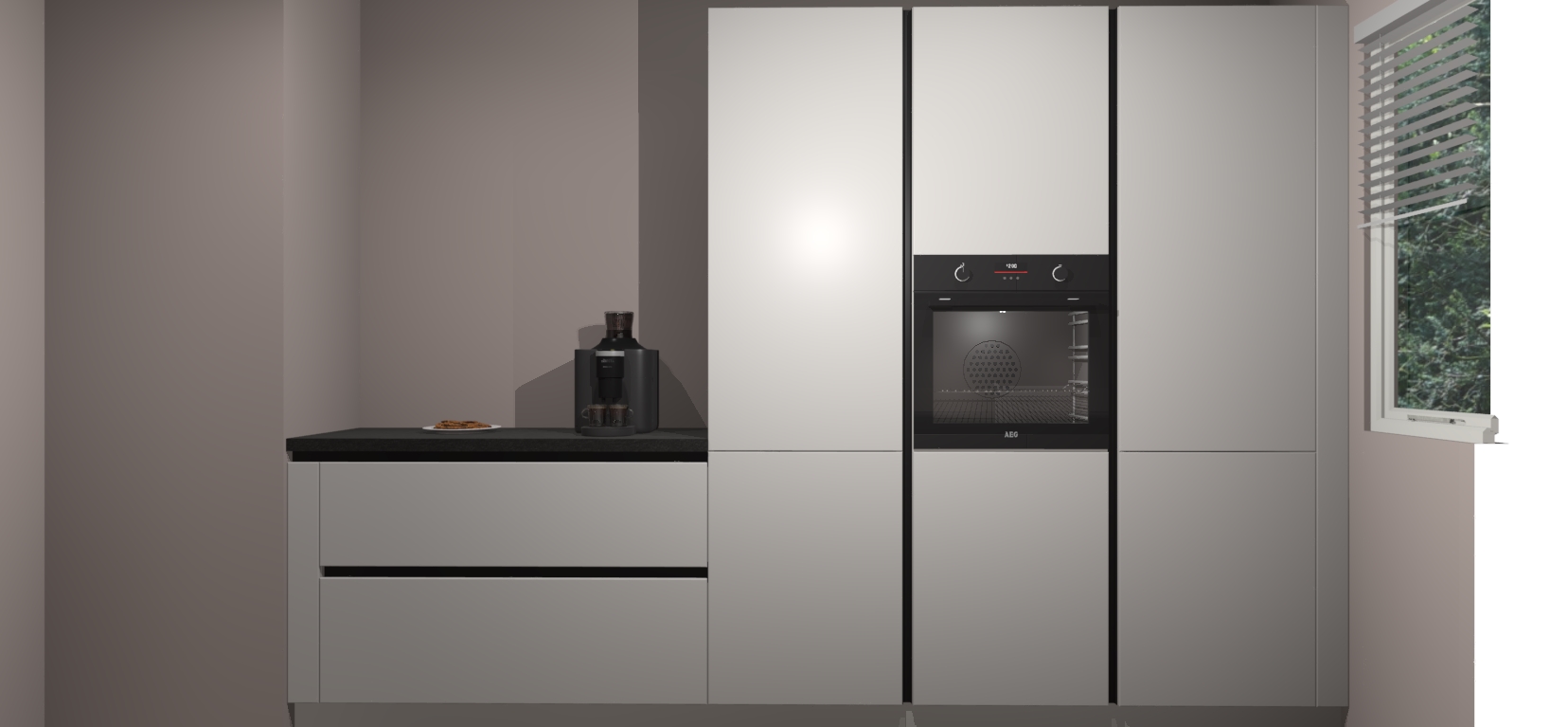 Een stijlvolle en praktische keuken als deze mag gezien worden. Dankzij de prachtige Zijdegrijze matte afwerking wordt de keuken gemakkelijk het middelpunt van uw huis - hij ziet er geweldig uit onder allerlei lichtomstandigheden, van dag tot nacht!